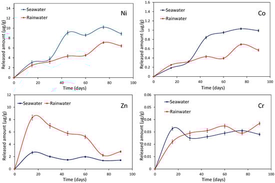 Evolution of the Ni, Co, Zn, and Cr concentrations during the leaching of the FNS sample in seawater and rainwater media. The released amounts are expressed as micrograms per gram of slag.
