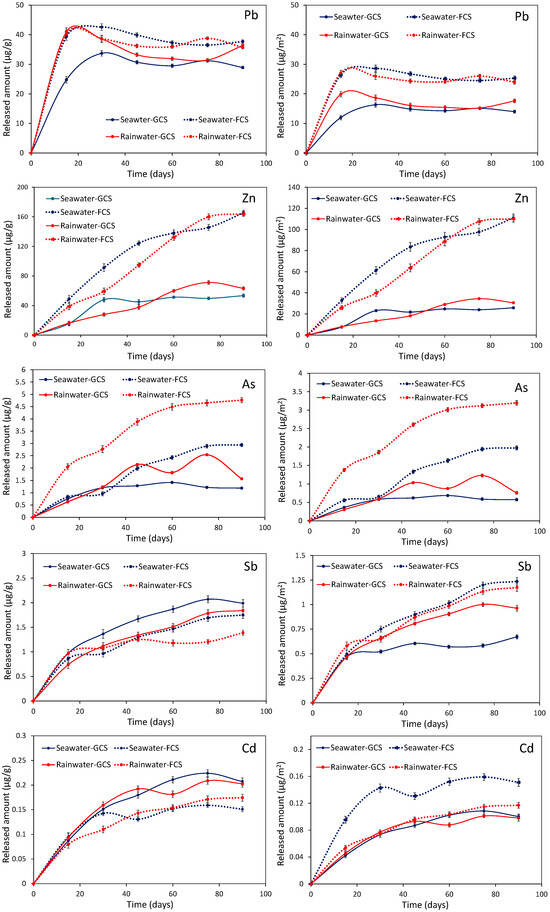 Evolution of the Pb, Zn, As, Sb, and Cd concentrations during the leaching of lead slags in seawater and rainwater media. The released amounts are expressed as micrograms per gram of slag in the curves on the left, and as micrograms per square meter (based on the specific surface areas, SSAs) in the curves on the right.