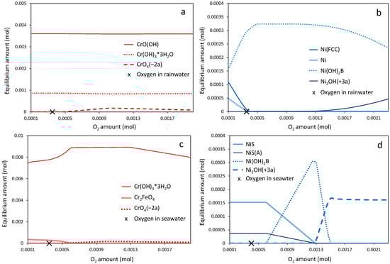 Equilibrium compositions of chromium and nickel phases in rain water (a,b) and in seawater (c,d) simulants at 20 °C (Case 1). Typical concentrations of dissolved oxygen in rainwater and seawater (10 and 8 ppm, respectively) are indicated (X) in the graphs.