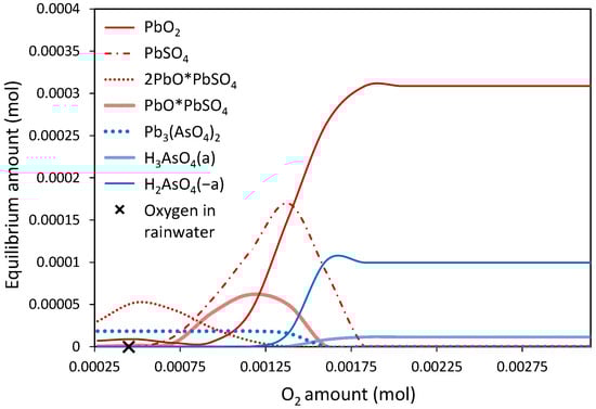 Equilibrium compositions of lead and arsenic phases in rainwater simulant at 20 °C (Case 2). The typical concentration of dissolved oxygen in rainwater (10 ppm) is indicated in the graph (X).