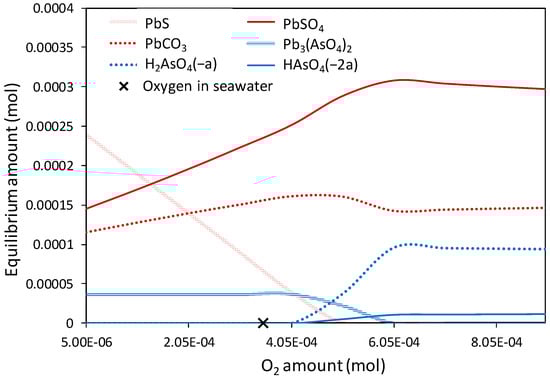 Equilibrium compositions of lead and arsenic phases in seawater simulant at 20 °C (Case 2). The typical concentration of dissolved oxygen in seawater (8 ppm) is indicated in the graph (X).
