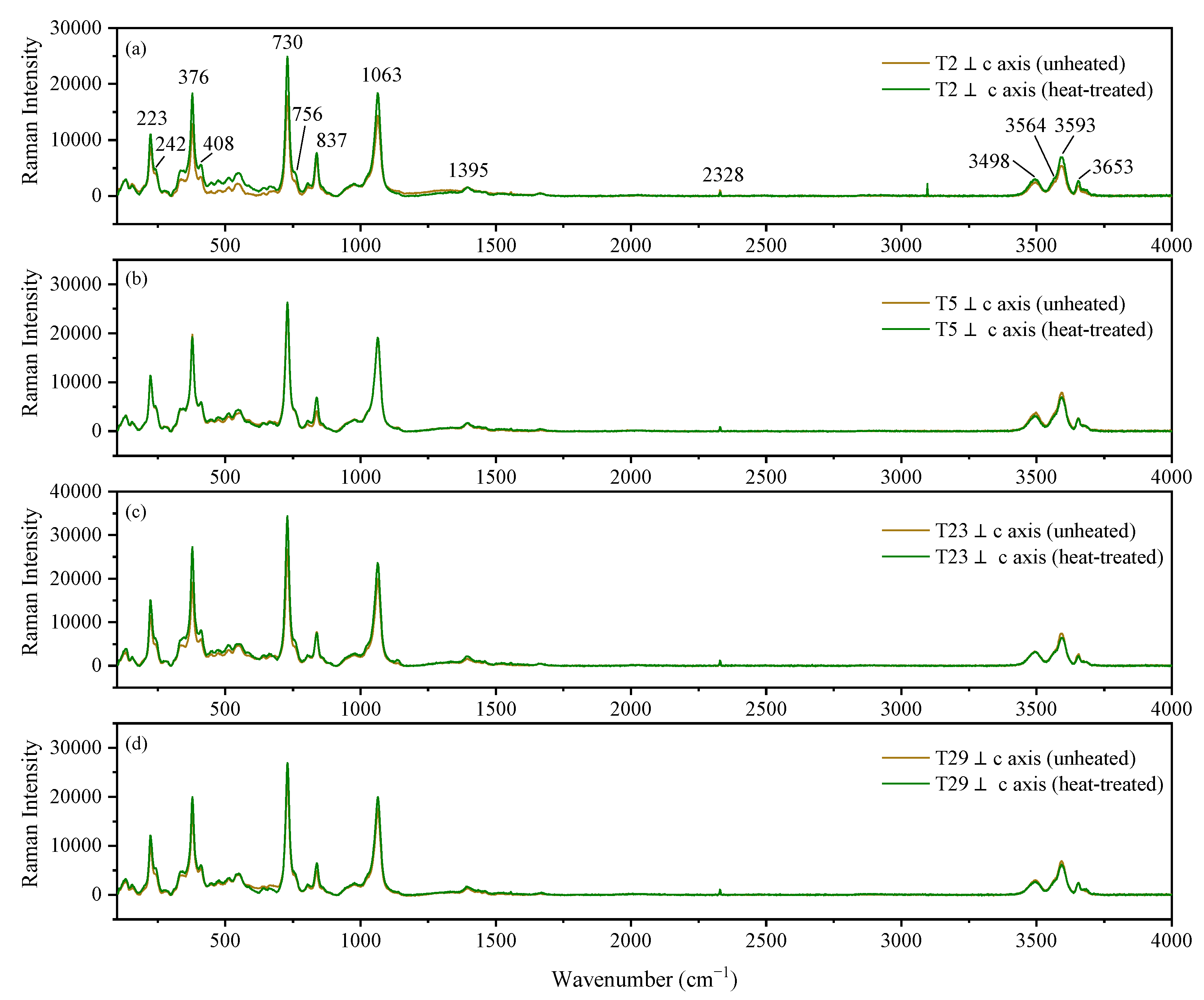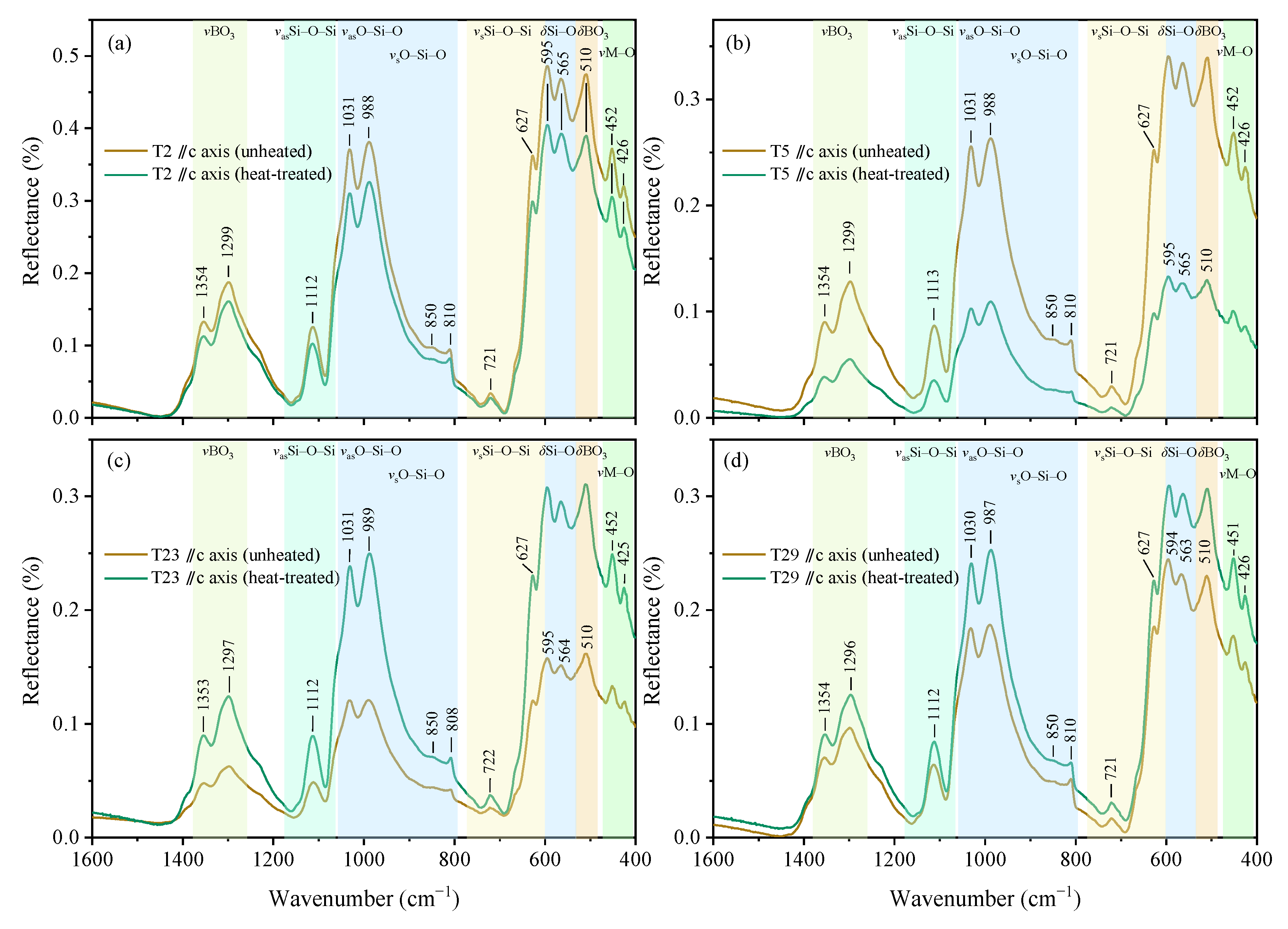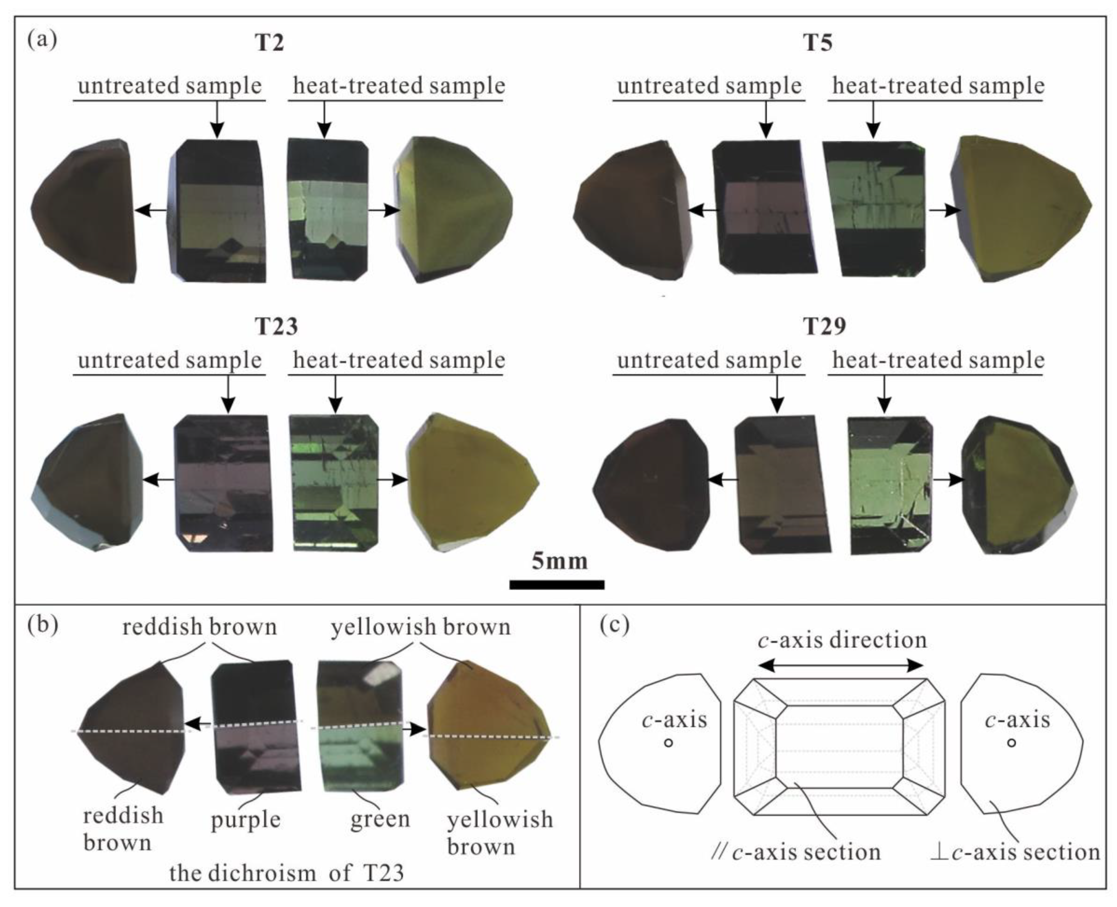 - Yue, S.W.; Yan, X.X.; Lin, J.Q.; Wang, P.L.; Liu, J.F. Spectroscopic Characteristics and Coloring Mechanism of Brown Tourmaline under Heating Treatment. Spectrosc. Spectr. Anal. 2021, 41, 2524–2529, (In Chinese with English Abstract). [Google Scholar]
