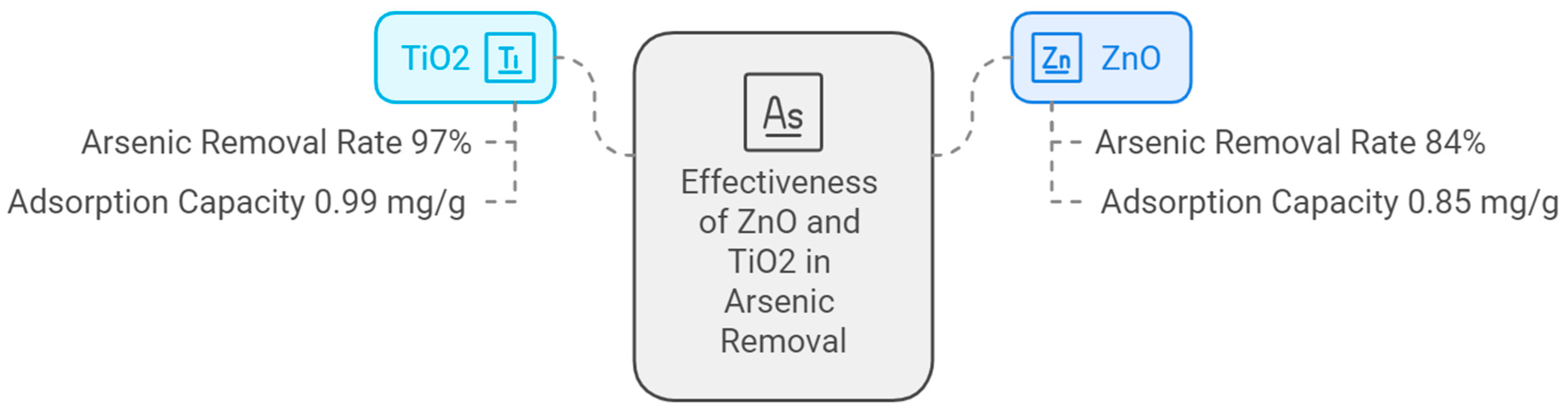- Chandan, A.K.; Mallika, G.N.; Narsaiah, T.B. A green approach to arsenic removal using ZnO nanoparticles synthesized from Acacia Catechu leaf extract. Mater. Today Proc. 2023, 72, 110–119. [Google Scholar] [CrossRef]