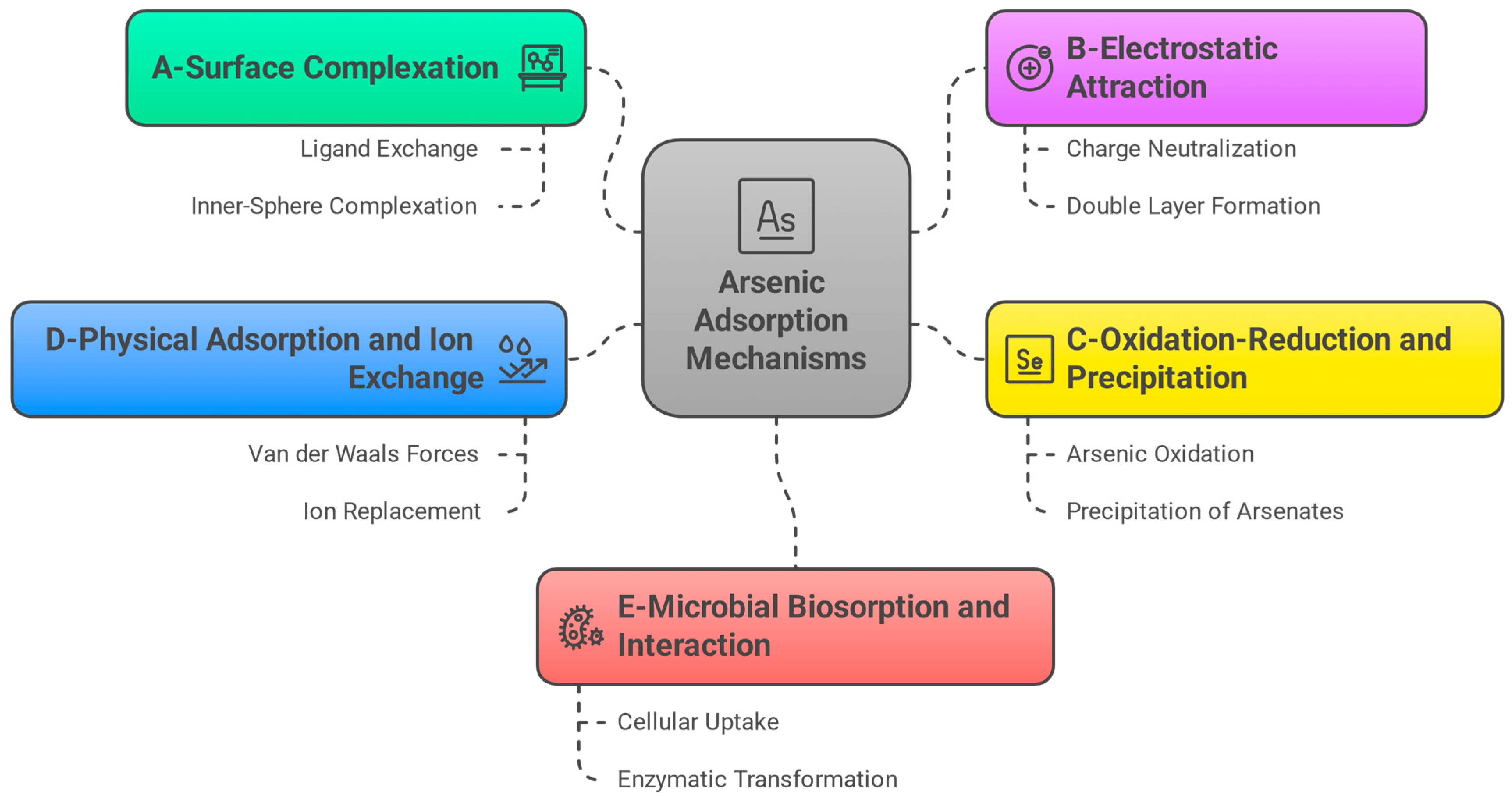 5.1. Physicochemical Mechanisms Regulating Arsenic Adsorption