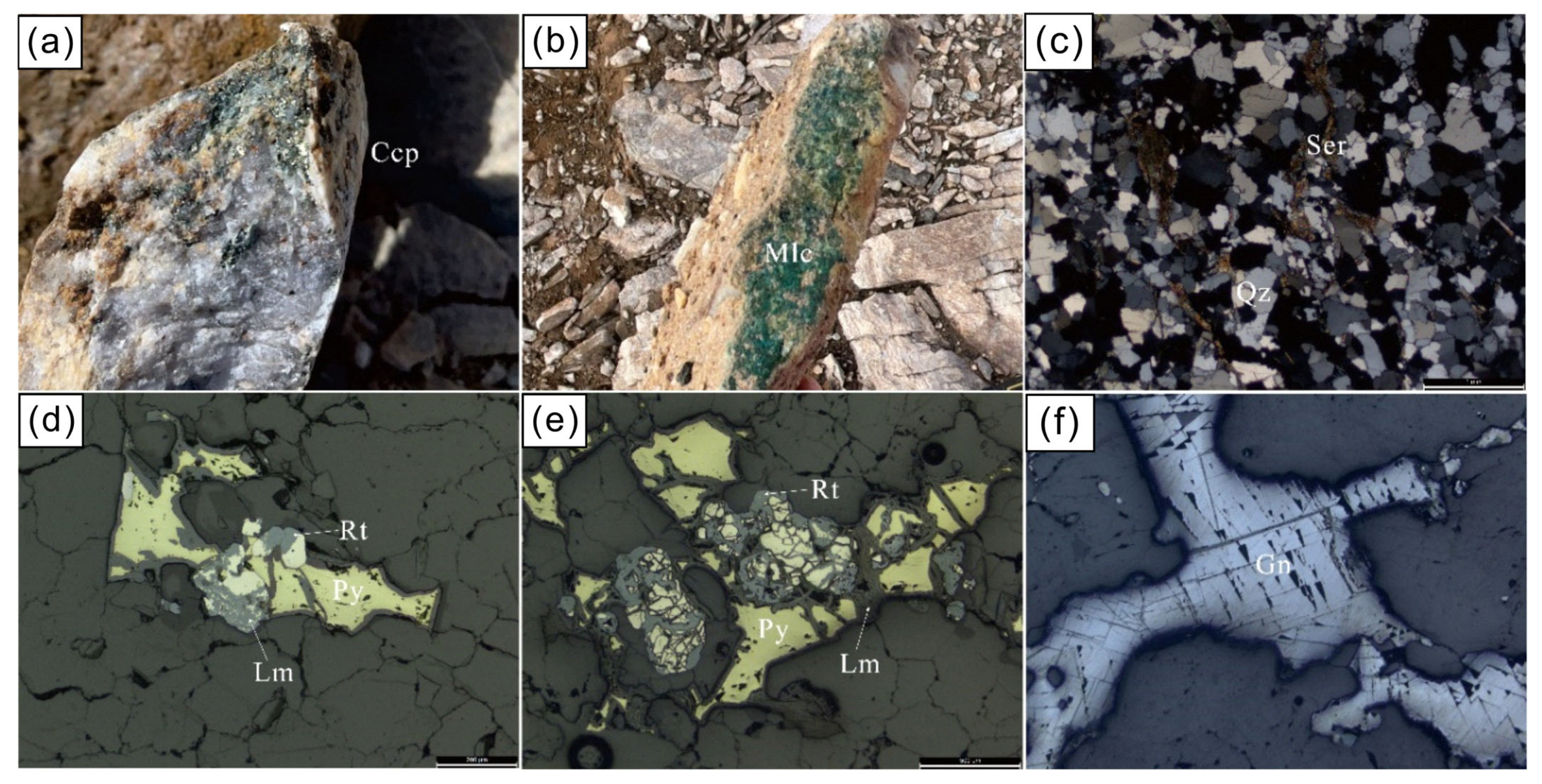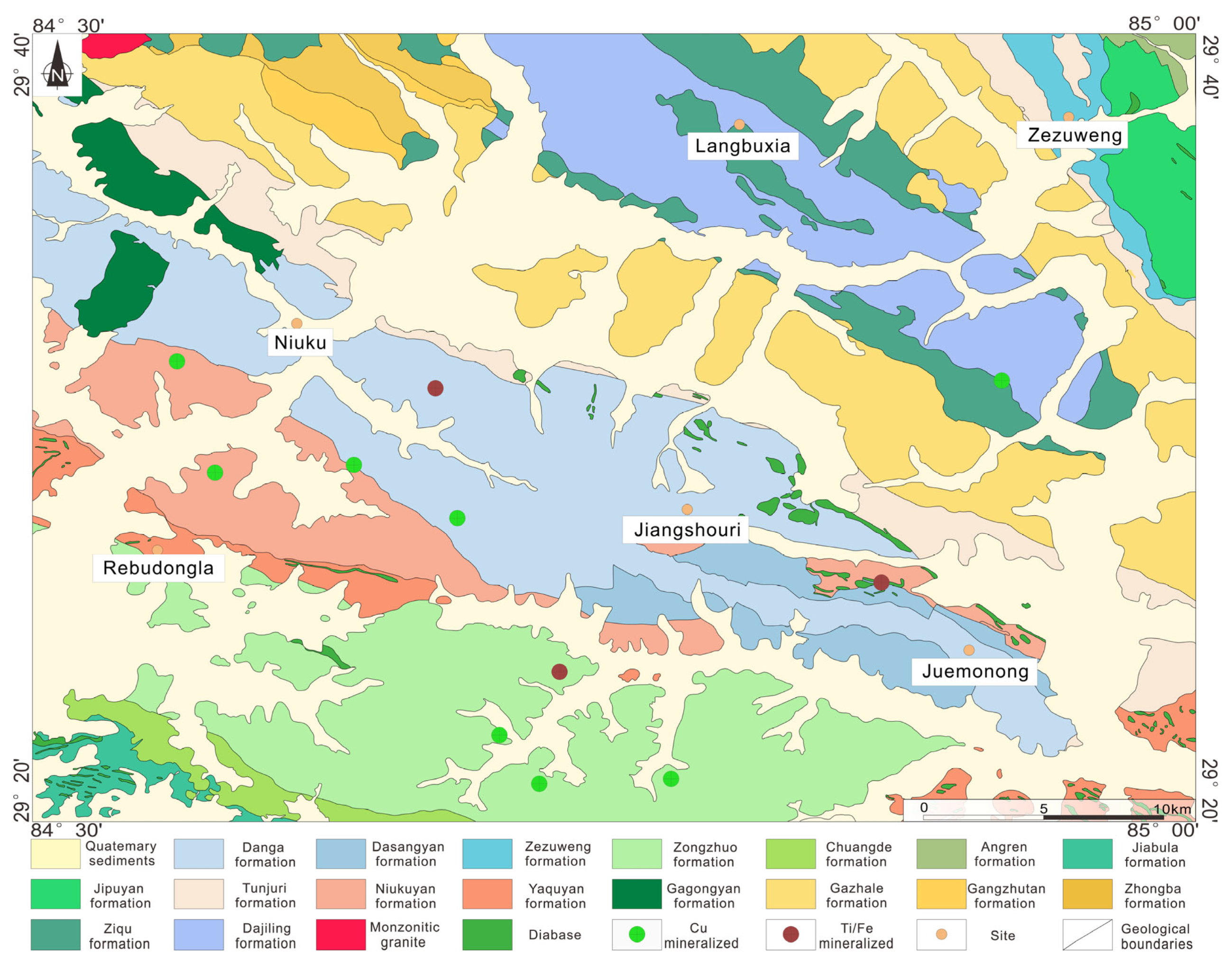 - Lin, B.; Tang, J.X.; Tang, P.; Beaudoin, G.; Laflamme, C.; Li, F.Q.; Zheng, W.B.; Song, Y.; Qi, J.; Sun, M.; et al. Multipulsed Magmatism and Duration of the Hydrothermal System of the Giant Jiama Porphyry Cu System, Tibet, China. Econ. Geol. 2024, 119, 201–217. [Google Scholar] [CrossRef]