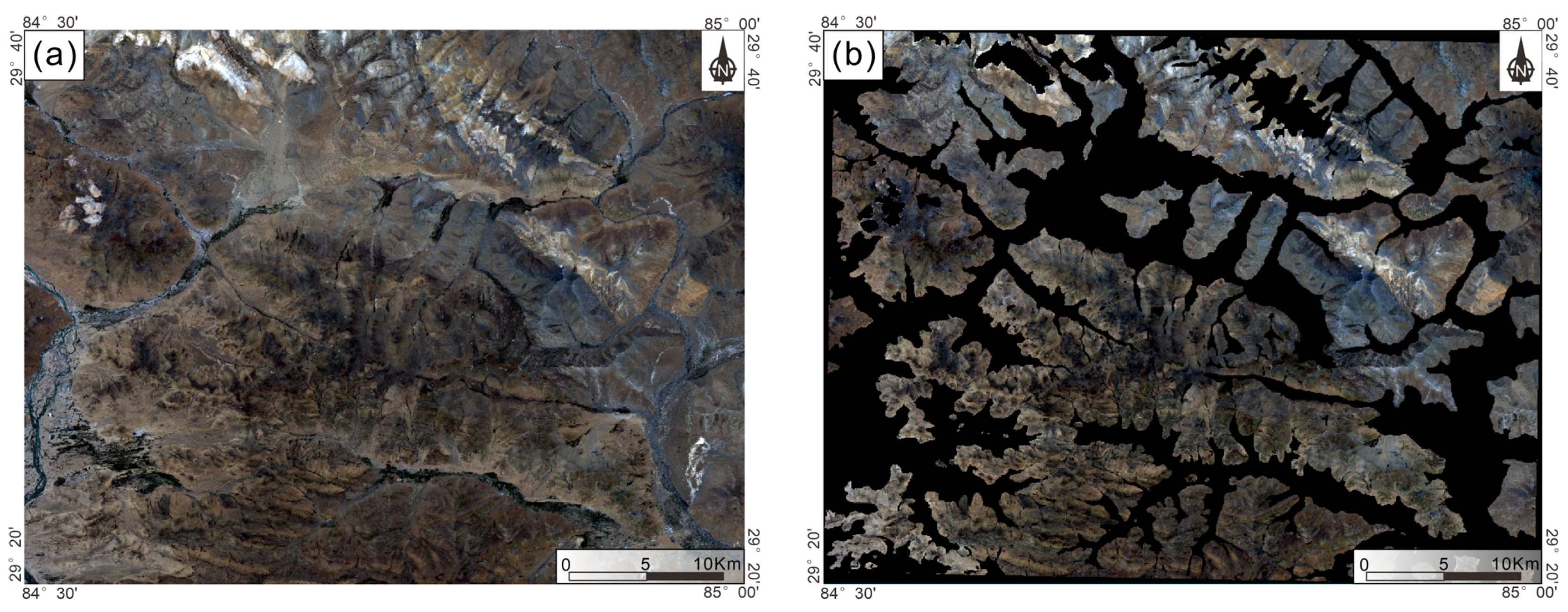- Chen, Q.; Cai, D.Y.; Xia, J.S.; Zeng, M.; Yang, H.Y.; Zhang, R.S.; He, Y.; Zhang, X.X.; Chen, Y.; Xu, X.H.; et al. Remote sensing identification of hydrothermal alteration minerals in the Duobuza porphyry copper mining area in Tibet using WorldView-3 and GF-5 data: The impact of spatial and spectral resolution. Ore Geol. Rev. 2025, 180, 106573. [Google Scholar] [CrossRef]