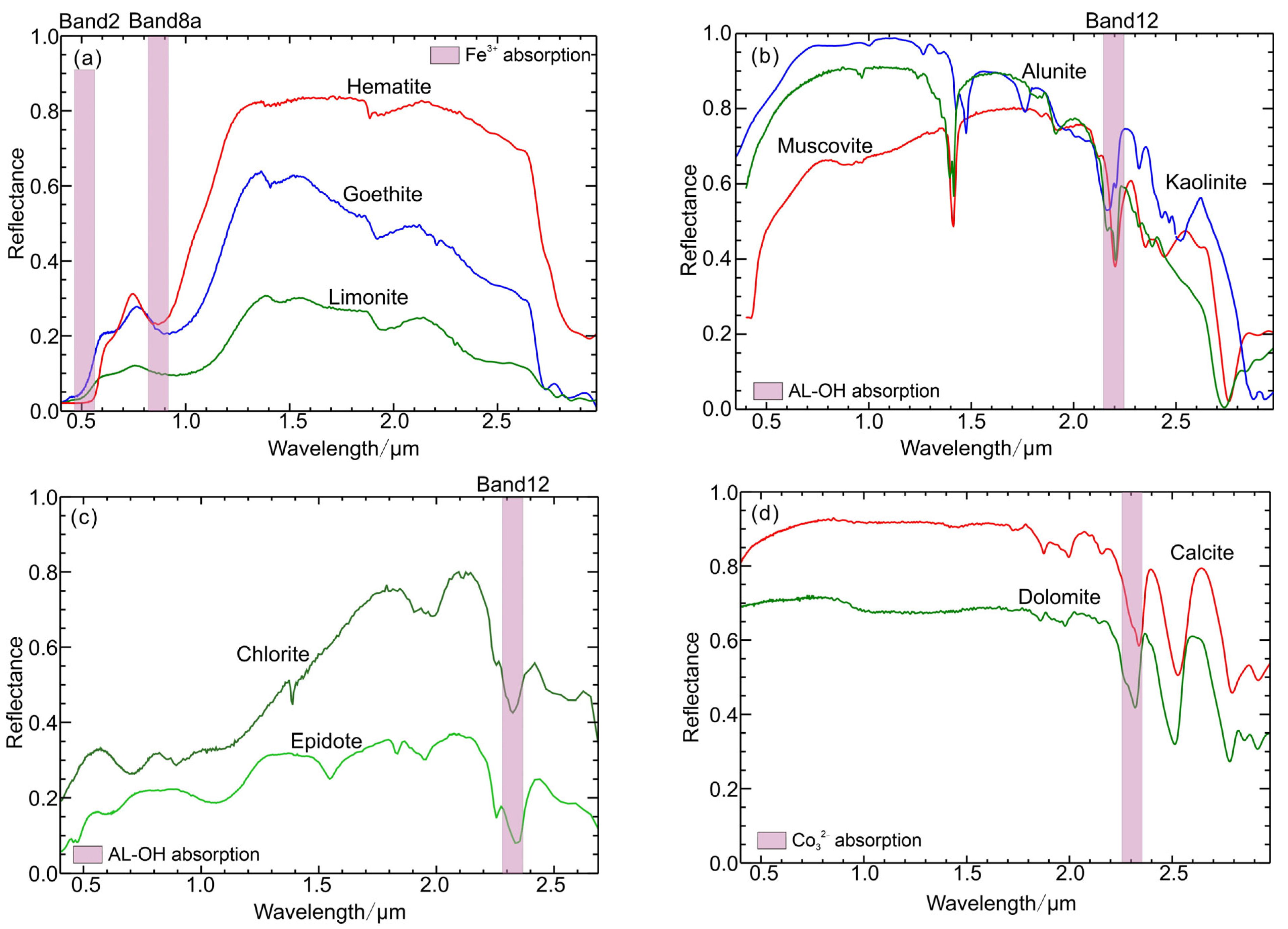 - Yang, C.; Jia, H.K.; Dong, L.F.; Zhao, H.S.; Zhao, M.H. Selection of Landsat-8 Operational Land Imager (OLI) Optimal Band Combinations for Mapping Alteration Zones. Remote Sens. 2024, 16, 392. [Google Scholar] [CrossRef]