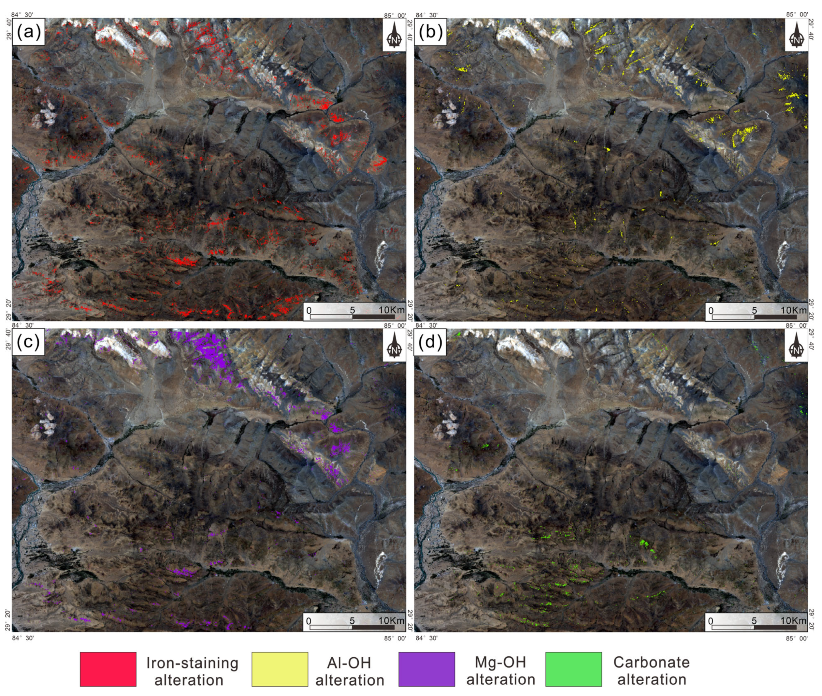 - Zhang, G.; Zhao, Z.F.; Zhang, X.L.; Wu, X.T.; Zheng, Y.F.; Feng, L.X.; Huang, Z.Q. Comprehensive Multi-Source remote sensing data integration for enhanced mineralization alteration extraction and geological structure interpretation in the Lala region of Sichuan Province. Ore Geol. Rev. 2024, 168, 106032. [Google Scholar] [CrossRef]