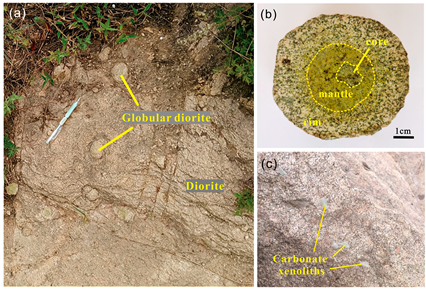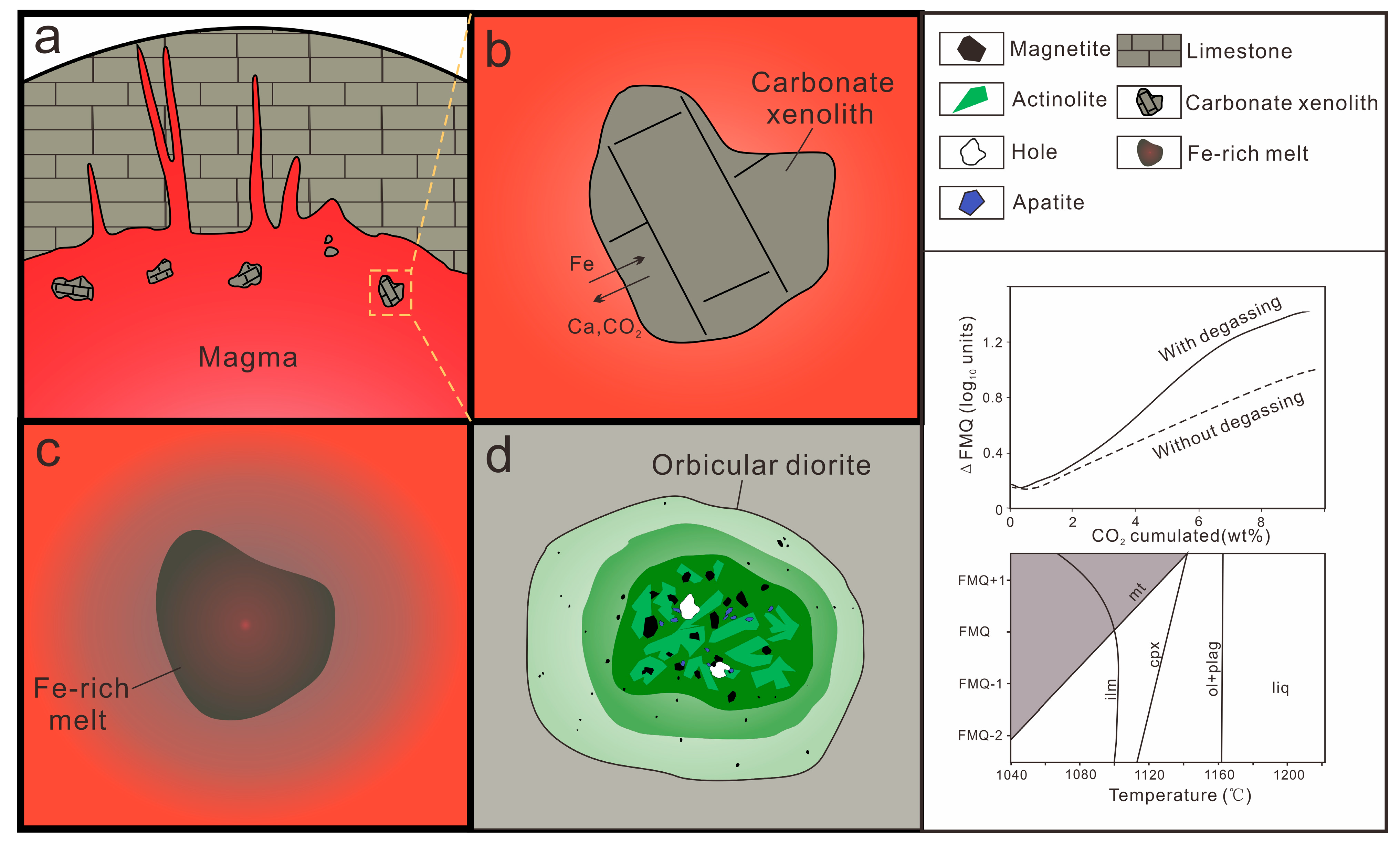 - The iron enrichment mechanism of the Wuan orbicular diorite is as follows: During upward intrusion of magma, hot magma reacts with the carbonate xenoliths [(Ca, Mg) CO3] to generate abundant CO2, which greatly increases the oxygen fugacity of the magmatic system; Under the action of CO2 and other volatile components, liquid immiscibility occurs in the magma chamber, and the Fe-rich oxide melt is formed by melting away. Iron oxides (Fe3O4/Fe2O3) will crystallize close to the liquidus due to high oxygen fugacity.