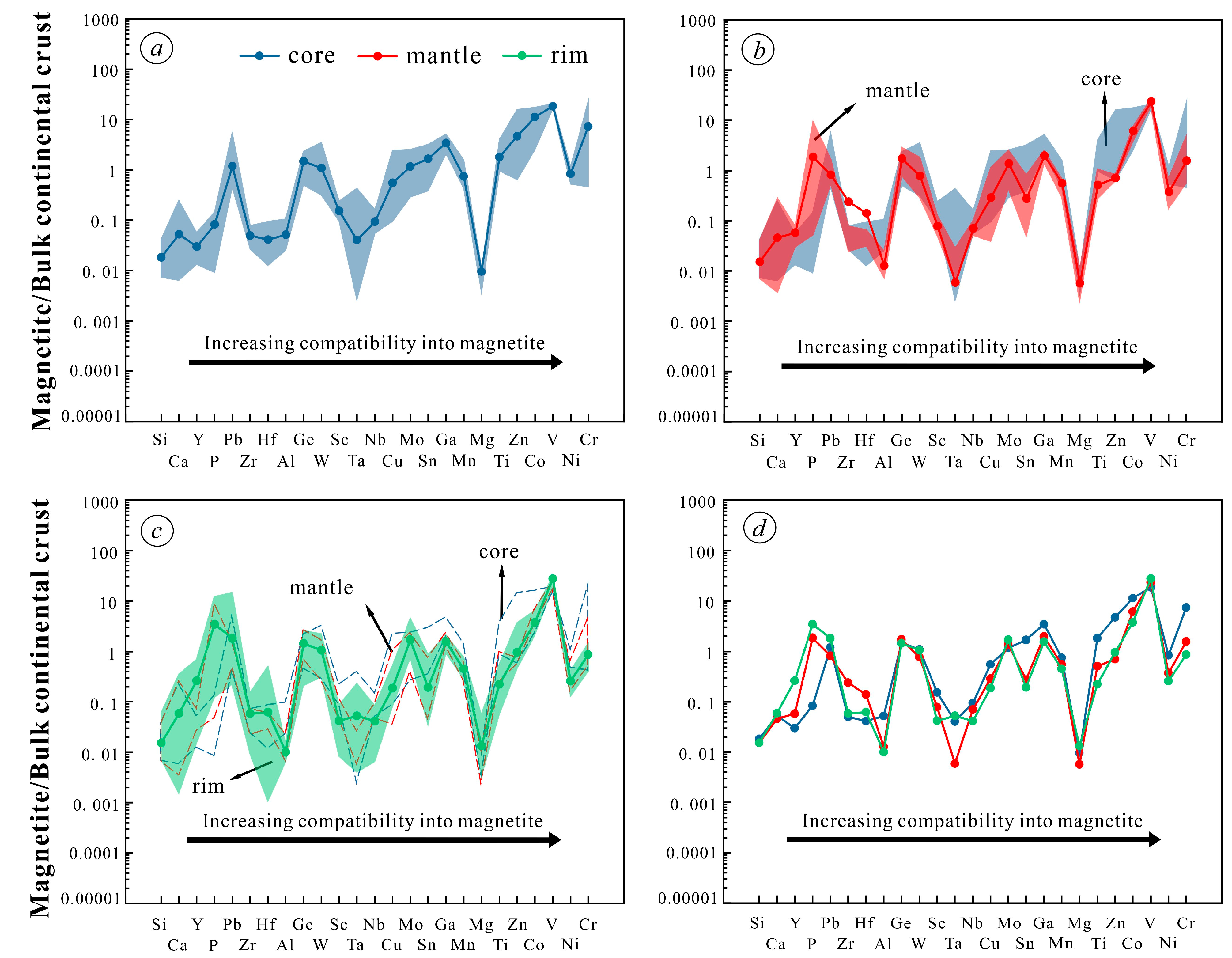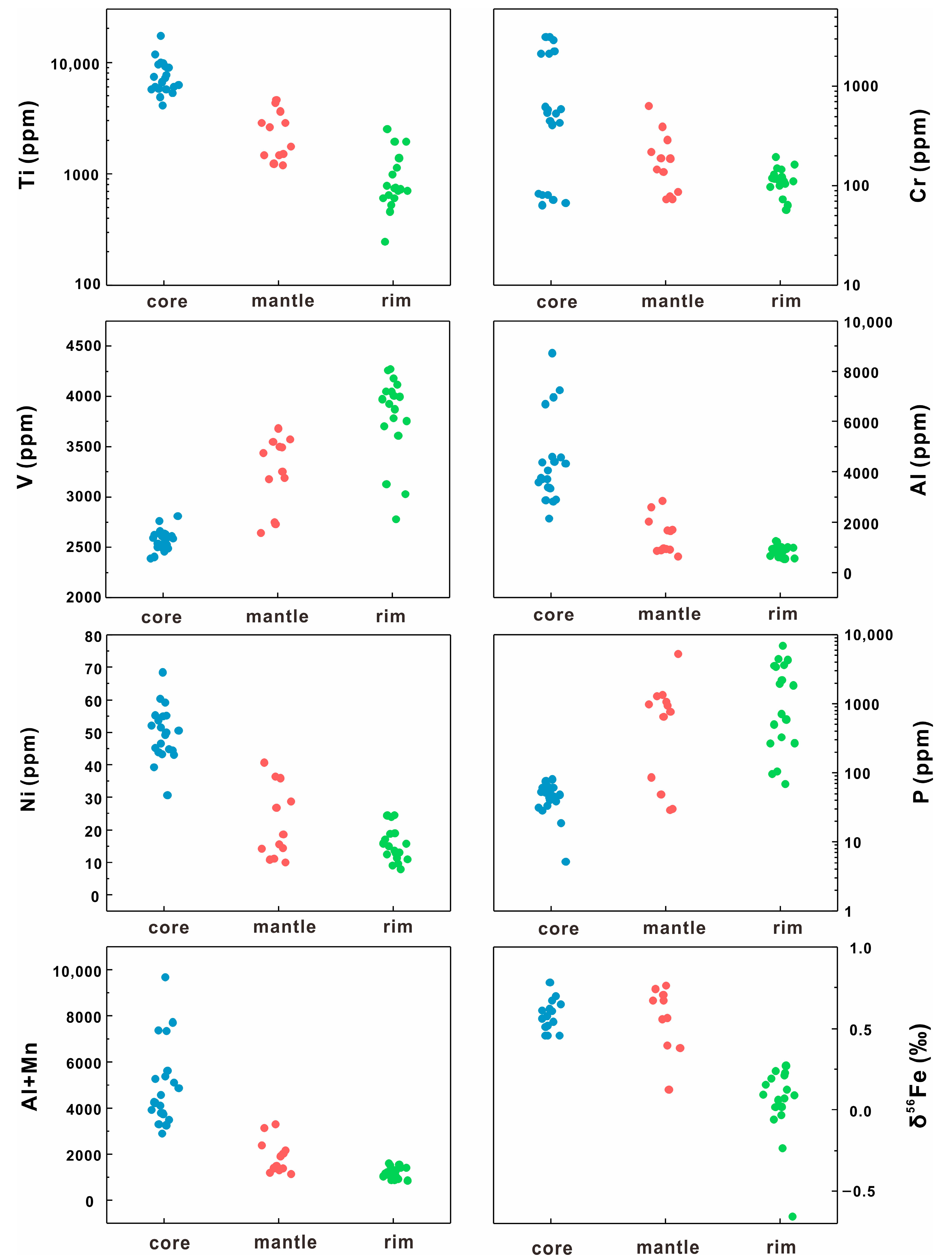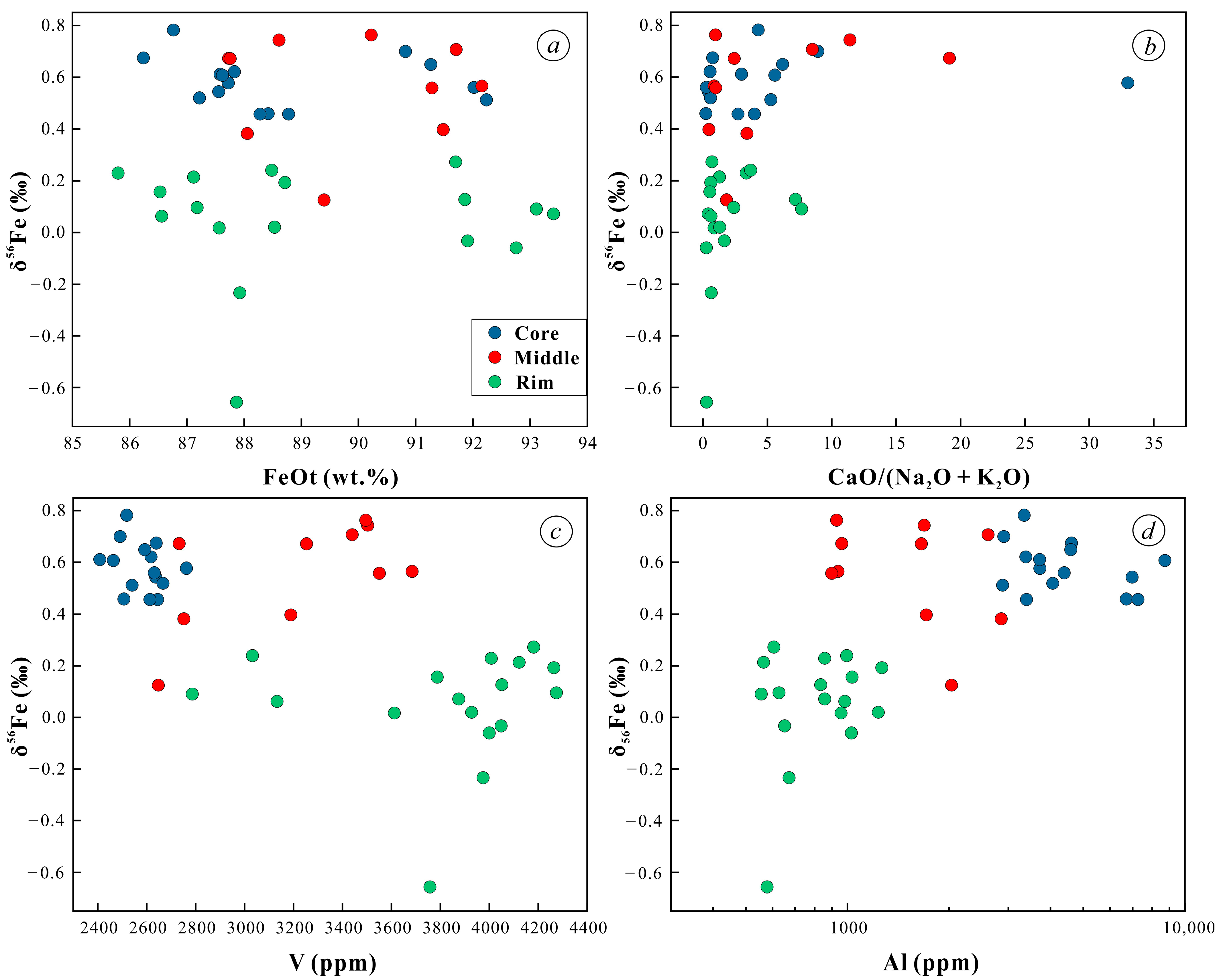 - The δ56Fe value of the core magnetite (0.46‰–0.78‰) is much higher than that of the mantle and rim magnetite in orbicules. The δ56Fe values of magnetite in different parts have no correlation with Fetotal and CaO/(Na2O + K2O), but they increase as the V content of magnetite gradually decreases. This large fractionation of iron isotopes is not caused by mineral fractionation, crystallization, or fluid alteration, but may be driven by liquid immiscibility that forms iron-rich melts under high oxygen fugacity.