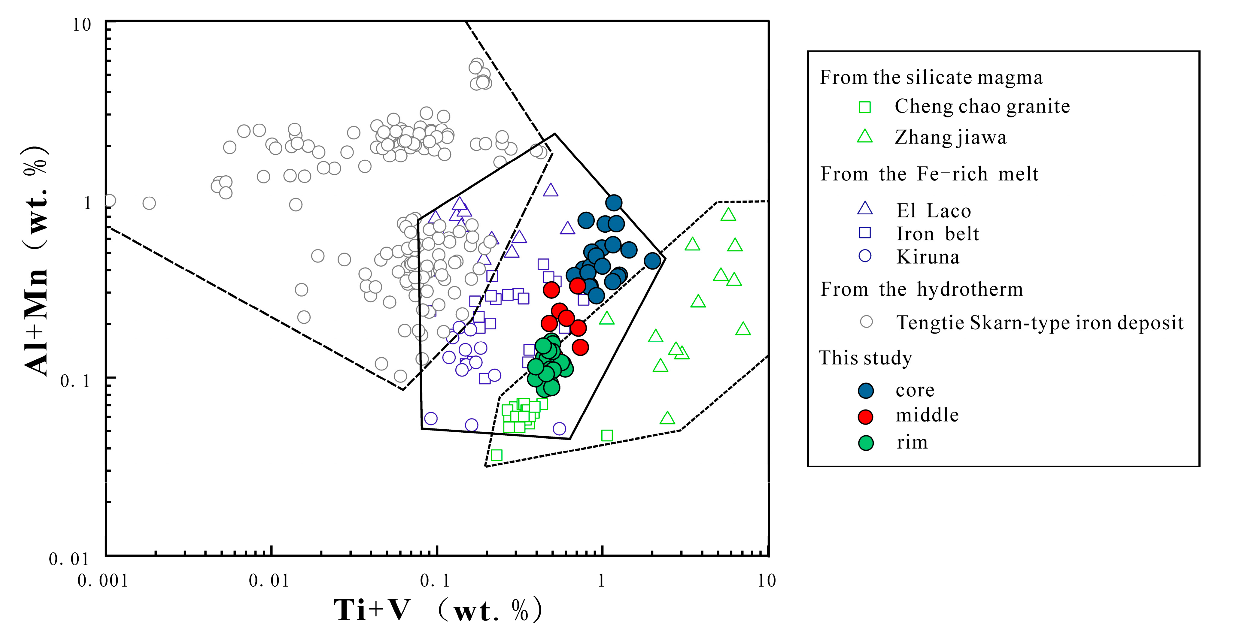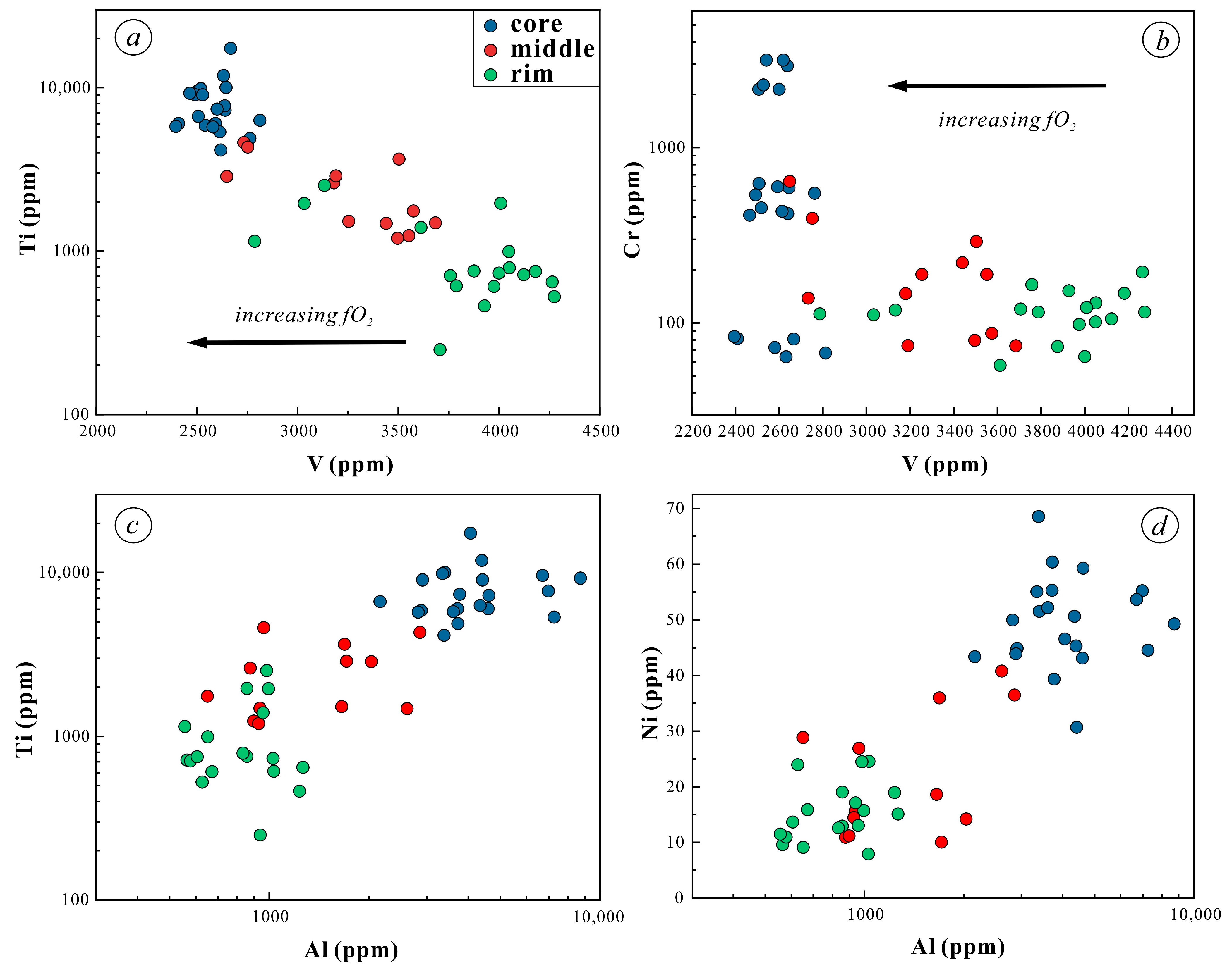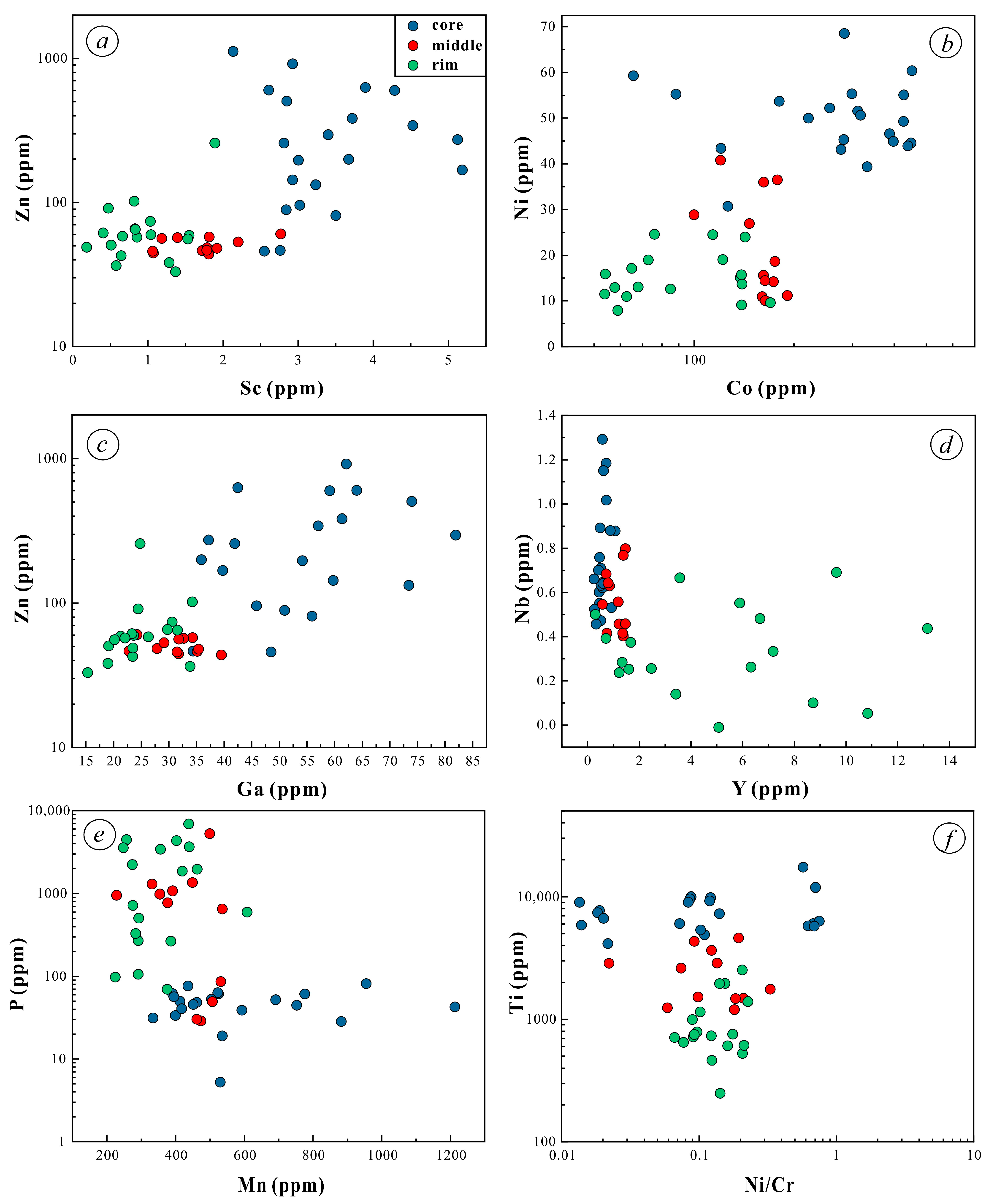 - Magnetite composition varies significantly across the orbicule: rim magnetite has a small particle size (about 200 μm) and is associated mainly with plagioclase and hornblende, indicating that it crystallizes from normal diorite magma. The magnetite in the core has a large particle size (>1000 μm), and is associated with apatite and actinolite, with apatite inclusions and a large number of vesicles in the core. The magnetites in the cores of orbicules have higher Ti, Al, Ni, Cr, Sc, Zn, Co, Ga, and Nb than those in the rim. The multi-peak distribution of Cr and the (Al + Mn) vs. (Ti + V) diagram of the magnetites in the cores of orbicules indicate that they crystallized from iron-rich melts.