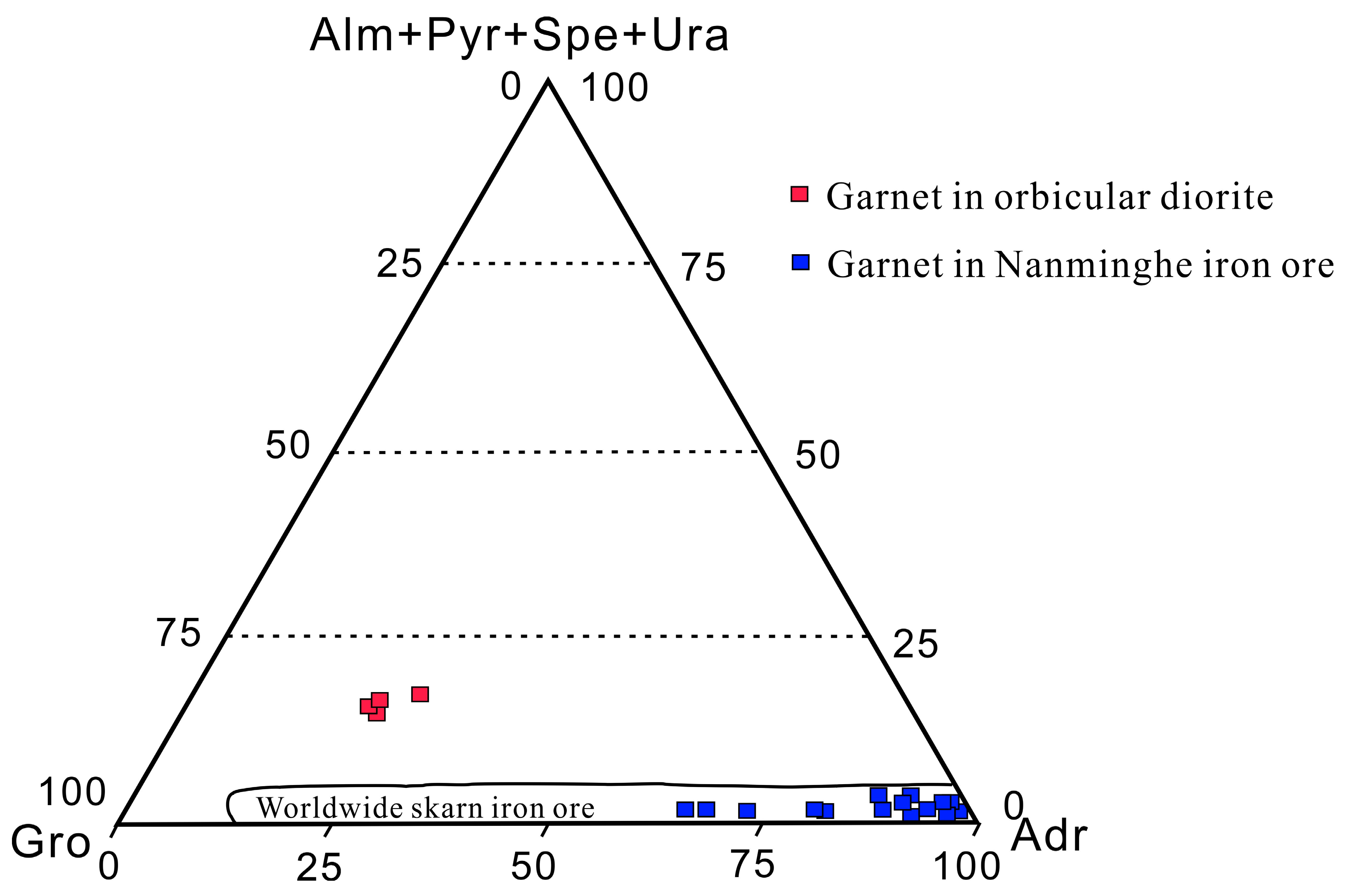 - The aforementioned characteristics of magnetite in the Tanling orbicular diorite (Wuan, Hebei Province) indicate that diorite magma reacts with carbonate xenoliths to form “Fe-rich melts”; furthermore, skarn iron ore deposits are probably formed by the reaction of intermediate-to-basic magma with carbonate rocks to generate such “Fe-rich melts”. A possible reaction is as follows: