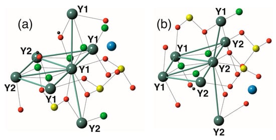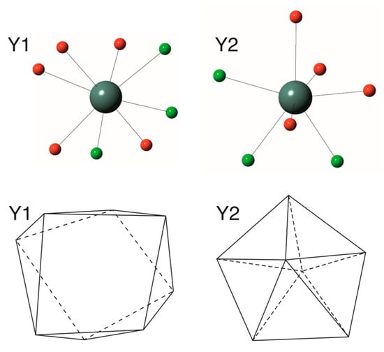The position of one H site was located through the inspection of the difference Fourier maps of electron density; other H sites could not be located. The occupancies of the Y sites were refined using mixed Y-Yb scattering curves for neutral atoms; the procedure implemented in SHELXL [] was applied with the Y and Yb curves used for the same site (two sites with the same coordinates and displacement parameters) and the total occupancy constrained to 1.0. Crystal data, data collection information, and structure refinement details are given in Table 2; atom coordinates and displacement parameters are given in Table 3, and selected interatomic distances are shown in Table 4. Table 5 provides the results of the bond valence analysis; the bond valence parameters for the cation–oxygen and cation–fluorine bonds have been taken from [,], respectively.