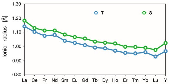 The ionic radii of trivalent lanthanide ions in []- and []-coordinated cations (blue and green, respectively) in comparison to Y3+ (on the right side of the diagram). The values of the ionic radii are taken from [].