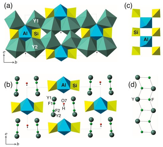 The crystal structure of kuliokite-(Y) is shown in Figure 5a,b. The strongest building unit of the structure is the [AlX2(SiO4)2] chain of corner-sharing AlX6 octahedra and SiO4 tetrahedra running along the a axis (Figure 5c). The chains have their planes oriented parallel to (001). The Y atoms are located in between the chains, along with the F− and (OH)− anions, providing the three-dimensional integrity of the crystal structure. Each F− anion is coordinated by three Y3+ cations to form planar (FY3)8+ triangles parallel to the (010) plane. The triangles share common edges to form [F2Y2]4+ chains, as shown in Figure 5d. The similar but isolated (FY3)8+ groups have also been observed in thalénite, Y3[Si3O10]F [,], and cappelenite-(Y), BaY6B6Si3O24F2 [].