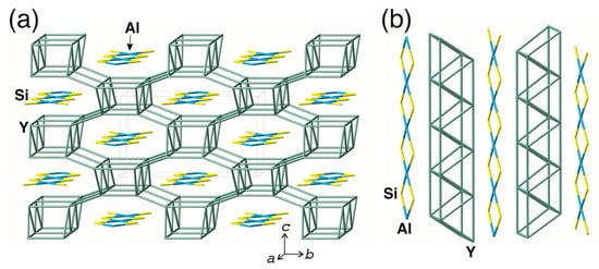 If the Y sites located from each other within 4.5 Å are linked by edges, a three-dimensional Y network is obtained, which is shown in Figure 7a. The network contains 6-coordinated nodes and possesses channels that are parallel to the a axis and accommodate the one-dimensional blue-and-yellow graphs that reflect the topologies of linkage of AlX6 and SiO4 polyhedra of the aluminosilicate chains shown in Figure 5c.