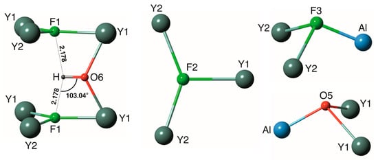 As was mentioned above, inspection of electron density difference Fourier maps allowed us to locate one H position only, namely one associated with the O6 site. The local environment of the H site is shown in Figure 8. There are no obvious strong hydrogen bonds donated by the OH6 group. There are two F- anions located at 2.178 Å from the H atom; however, these H…F distances are too long for the hydrogen bonds formed by fluorine atoms []. The bond valence sums associated with the O5 and O6 sites are equal to 1.22 and 1.10 v.u., respectively, which agrees well with their assignment to hydroxyl groups.