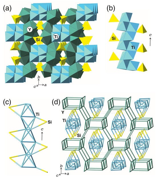 It is of interest that the crystal structure of kuliokite-(Y), when viewed in terms of its cationic network (Figure 7), is topologically related to the crystal structure of trimounsite-(Y), Y2Ti2(SiO4)O5 [,], a rare yttrium titanosilicate from the Trimouns talc deposit, Ariège, France. In trimounsite (Figure 9a), the basic structural unit is the [Ti2O5(SiO4)] chain consisting of the backbone chain of edge-sharing TiO6 octahedra incrustated by single SiO4 tetrahedra (Figure 9b,c). The titanosilicate chains are linked by Y3+ cations located in between the chains. The topology of linkage of YOn polyhedra in trimounsite-(Y) is identical to that observed in kuliokite-(Y) and corresponds to the skd network topology (Figure 9d). The one-dimensional channels in the skd network are occupied by complex Ti-Si chain graphs shown in Figure 9c.