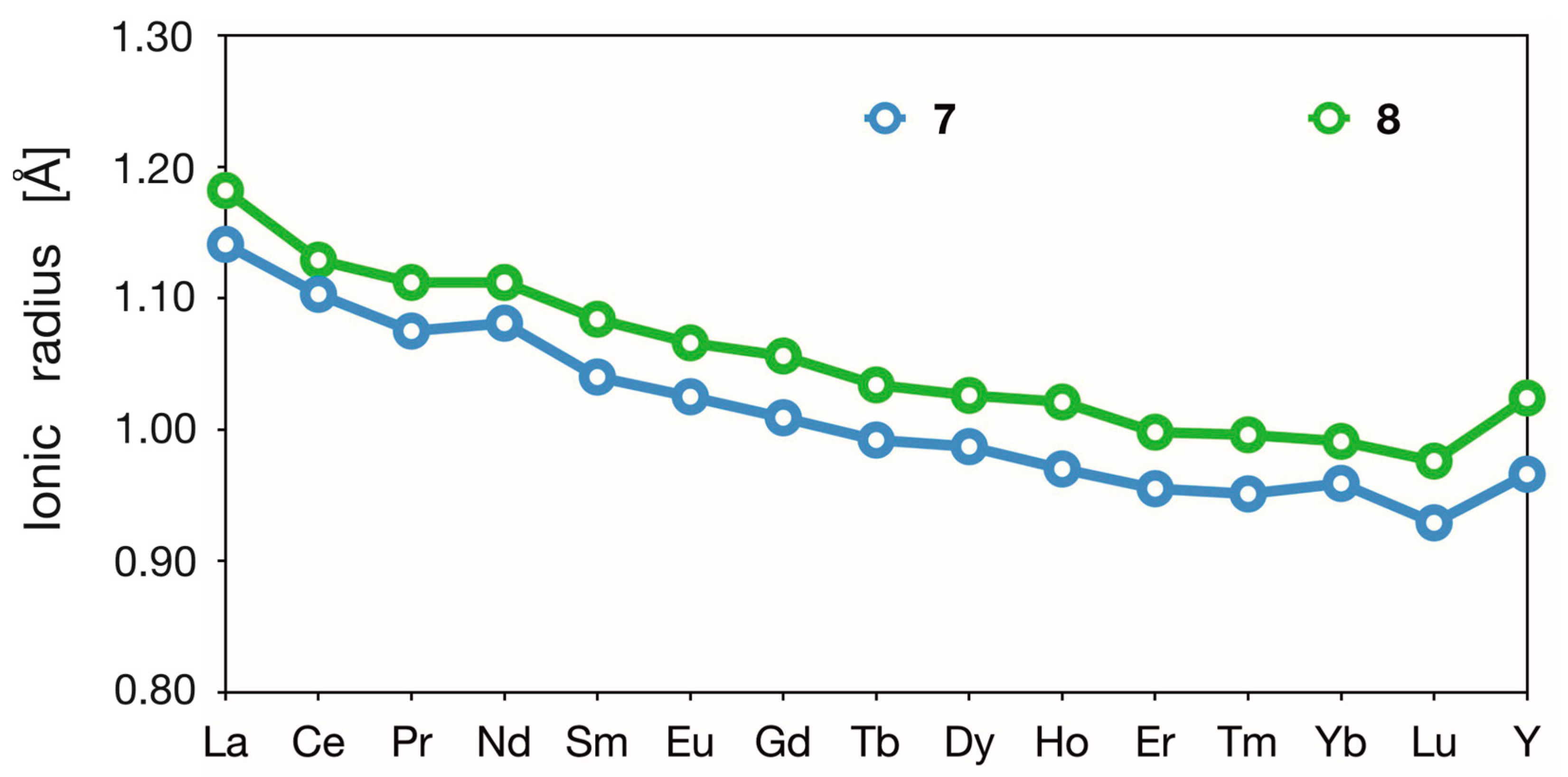 - Jordan, R.B. Lanthanide Contraction: What Is Normal? Inorg. Chem. 2023, 62, 3715–3721. [Google Scholar] [CrossRef]