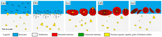 The evolution and formation mechanism of ooids oolitic iron ores [41]. (a) Seawater is saturated with cations and anions especially Fe, Si and Al. (b) Precipitation of these cations and anions as hematite and chamosite over nucleus at the water-sediments interface. (c) Development of the hematite and chamosite as discontinuous laminae. (d) Complete formation of ooids in concentric (elliptical and spherical shapes) or eccentric textures. (e) Some ooliths were broken by local currents before they were buried in the sediment. (Reprinted with permission from Ref. [41]. Copyright 2017 Elsevier).