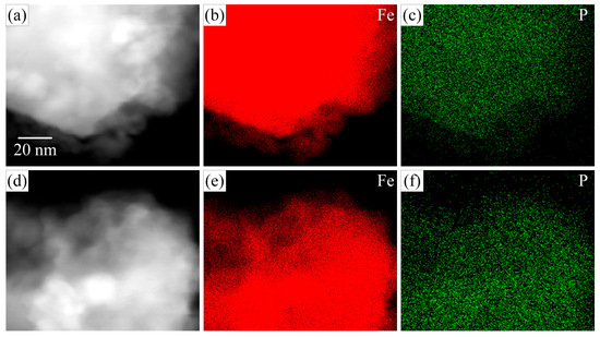 TEM image of a single iron mineral particle [57]: (a,d)—TEM images of iron mineral particles; (b,c)—Elemental maps of iron and phosphorus corresponding to (a); (e,f)—Elemental maps of iron and phosphorus corresponding to (d). (Reprinted with permission from Ref. [57]. Copyright 2023 University of Science and Technology Beijing).