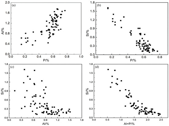 Relationship of element contents in iron minerals of high-phosphorus iron ore from Algeria [36]: (a) Phosphorus content and aluminum content, (b) Phosphorus content and silicon content, (c) Silicon content and aluminum content, (d) Silicon content and aluminum + phosphorus content. (Reprinted with permission from Ref. [36]. Copyright 2023 Elsevier).