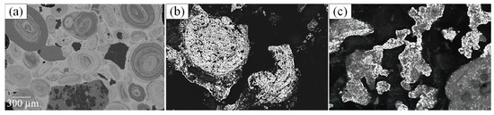 Microstructures of raw ore and reduced products [68,88]: (a) raw ore; (b) microstructure of reduced products without addition of dephosphorization agent; (c) microstructure of reduced products with addition of Na2CO3. ((a) Reprinted with permission from Ref. [68]. Copyright 2024 Oficyna Wydawnicza Politechniki Wrocławskiej. (b,c) Reprinted with permission from Ref. [88]. Copyright 2014 University of Science and Technology Beijing).