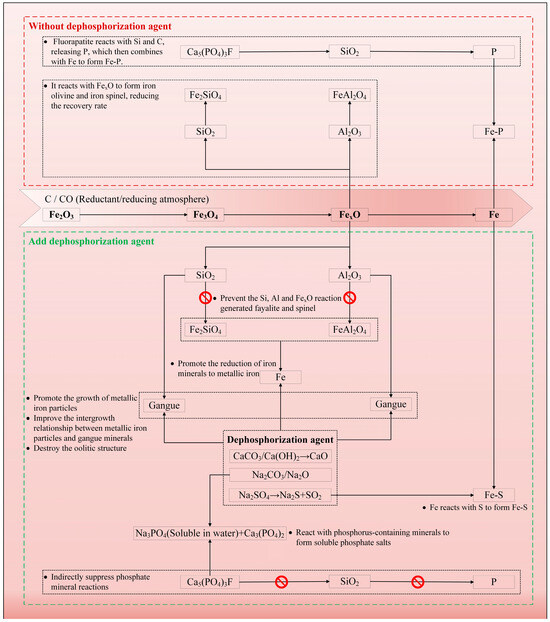 In summary, the addition of dephosphorization agents is essential in the coal-based direct reduction process of high-phosphorus iron ore. The mechanism of action of dephosphorization agents is illustrated in Figure 6. The dephosphorization agents function by: (1) indirectly suppressing the reactions of phosphorus-bearing minerals or directly reacting with phosphorus to form soluble compounds, thereby preventing the incorporation of phosphorus into metallic iron; (2) promoting the reduction of iron oxides and enhancing coal gasification, which increases iron recovery; (3) disrupting the oolitic structure, facilitating the growth of metallic iron particles, and improving the intergrowth relationship between metallic iron and gangue, thereby enhancing iron grade. In general, the addition of dephosphorization agents contributes to improvements in three key process indicators: phosphorus content, iron recovery, and iron grade.