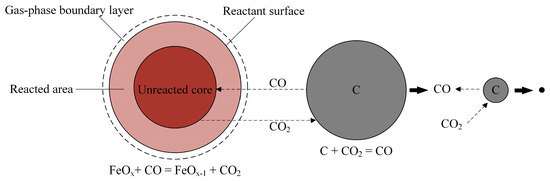 The two-step nucleation theory of direct reduction of iron oxides provides further insight into the rate-controlling factors at different stages of the reduction process. Since the CO and CO2 generated during reduction cannot be directly removed from the reaction system, the overall process consists of a combination of indirect reduction reactions and the gasification reaction of carbon. In the early stage of reduction, the iron oxides are in close contact with the reductant, and the reaction is dominated by solid–solid interactions. As the reaction proceeds, this contact weakens, and gas–solid reactions become predominant. Therefore, in the initial stage, the rate of carbon gasification is lower than that of the gas–solid reduction of iron oxides, making carbon gasification the rate-limiting step. With continued reduction, the diffusion of reducing gases through the solid phase becomes the dominant rate-controlling factor [118,119]. A schematic diagram illustrating the two-step nucleation mechanism for the direct reduction of iron oxides is presented in Figure 7.