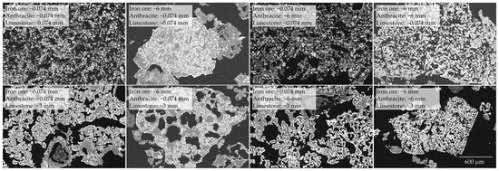 Some studies have also reported that the particle size of raw materials has no significant effect on the phase composition of the reduction products, but it does affect the morphology of metallic iron particles in the reduced product [67], as shown in Figure 8. Among the raw materials, limestone particle size has the most significant influence on the morphology of metallic iron particles, followed by ore particle size, with anthracite particle size having the least effect. The metallic iron particles in the reduced products from different raw material particle size combinations mainly exist in the form of fine dots, larger dot-like particles, stripes, and the largest band-like structures. Among these, the larger dot-like metallic iron particles are the most likely to achieve monomeric liberation from gangue minerals.
