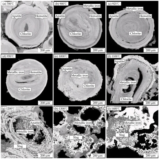 One of the primary challenges in the dephosphorization of high-phosphorus oolitic iron ores lies in the extremely fine intergrowth between iron minerals and gangue, often exhibiting a complex, multi-layered wrapping structure. This intricate texture makes it difficult to achieve complete liberation of iron-bearing phases. When the temperature reaches a certain threshold, direct reduction can partially disrupt the oolitic structure of the ore. However, at excessively high temperatures, although the oolitic texture may be further destroyed, phosphorus tends to be reduced to elemental phosphorus and subsequently incorporated into the metallic iron phase [88].