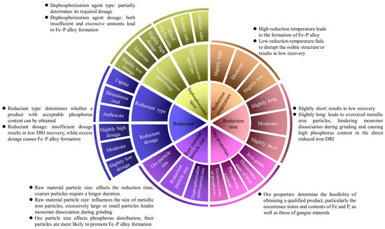 In summary, the factors influencing iron phase transformation and the efficiency of iron enrichment and dephosphorization are complex and multifaceted. These factors are summarized in Figure 10. There are six primary aspects affecting iron phase transformation and the removal of phosphorus: (1) ore properties; (2) raw material particle size; (3) type and dosage of reductant; (4) type and dosage of dephosphorization agent; (5) reduction temperature; and (6) reduction time. To achieve optimal reduction performance, it is essential to adjust the type and dosage of both reductant and dephosphorization agent, as well as reduction temperature and reduction time, based on the specific ore properties and particle size. These parameters must be maintained within appropriate ranges to obtain favorable iron recovery and phosphorus removal. Additionally, the conditions of the grinding–magnetic separation process also significantly influence the overall effectiveness of iron enrichment and dephosphorization.