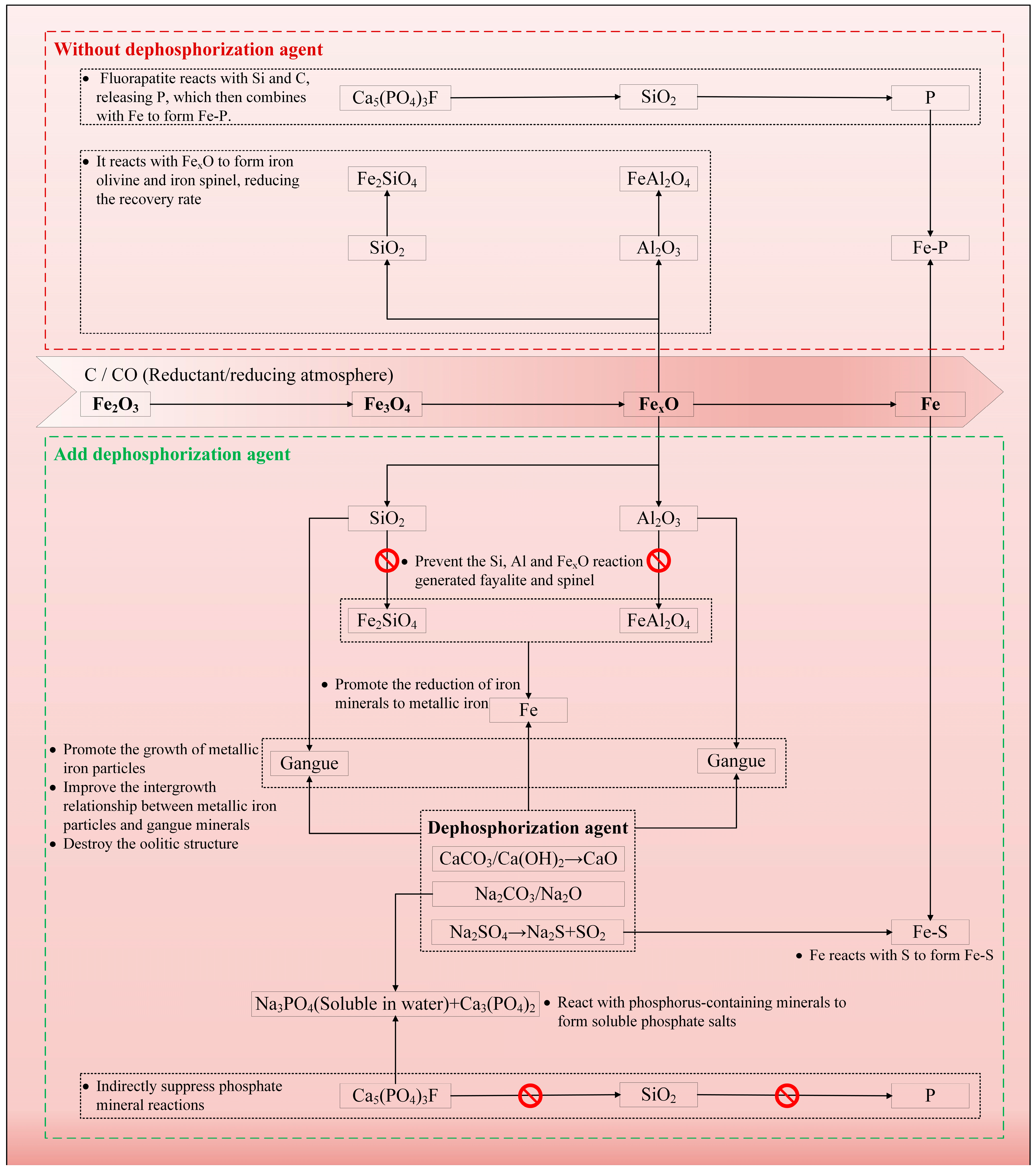 - Xu, H.D.; Sun, T.C.; Wu, S.C.; Lian, X.X.; Han, W.L.; DENG, Z.Y. Research Progress on the Effects of Reducing Agents and Dephosphorization Agents on Direct Reduction-Magnetic Separation of High-Phosphorus Oolitic Hematite. Multipurpose Util. Miner. Resour. 2024, 45, 176–184. [Google Scholar] [CrossRef]