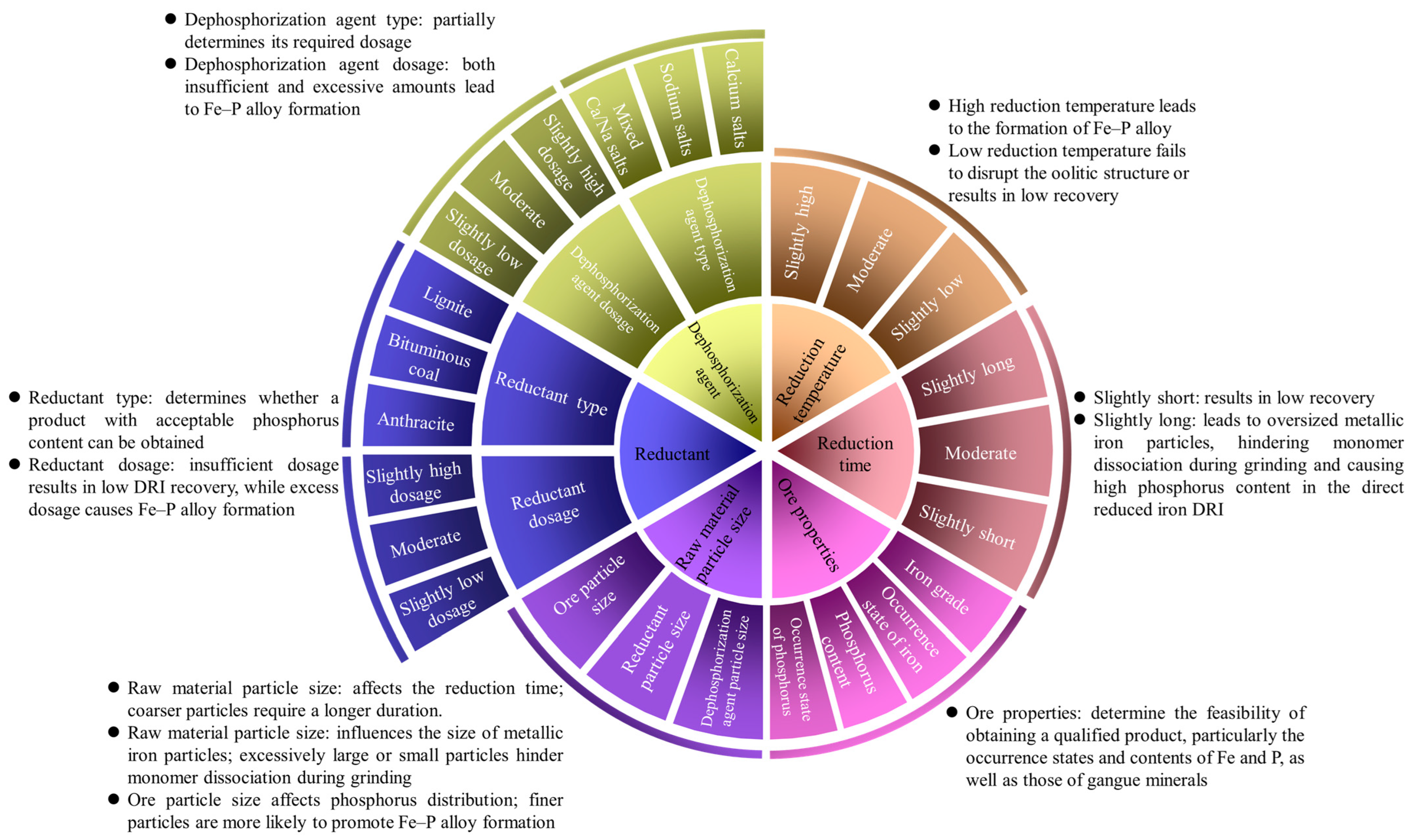 - In the coal-based direct reduction of high-phosphorus oolitic iron ores, the phase transformation of iron minerals proceeds in the sequence of Fe2O3 → Fe3O4 → FeO (FeAl2O4, Fe2SiO4) → Fe. The factors influencing the transformation of iron phases and the efficiency of iron enrichment and phosphorus removal are complex. Under the condition that phosphorus-containing phases are not reduced, favorable results in terms of iron enrichment and phosphorus removal can only be achieved by controlling the reduction temperature, reduction time, and types and dosages of reductants and dephosphorization agents, as well as grinding–magnetic separation parameters within appropriate ranges.