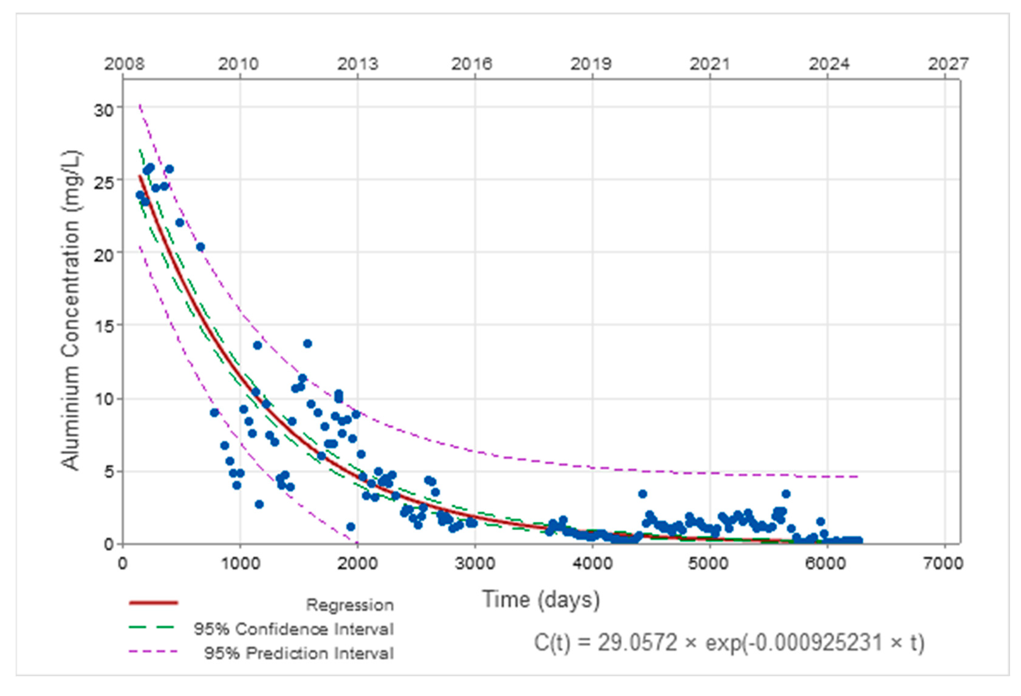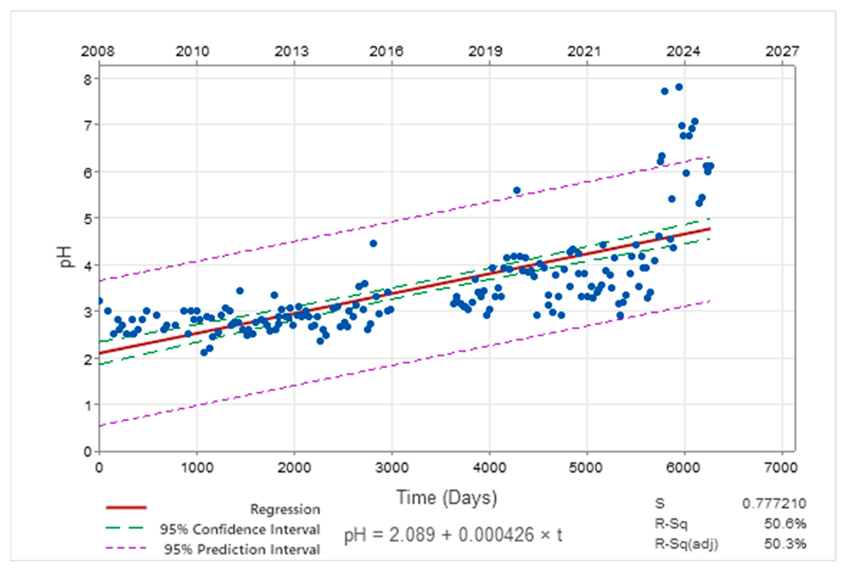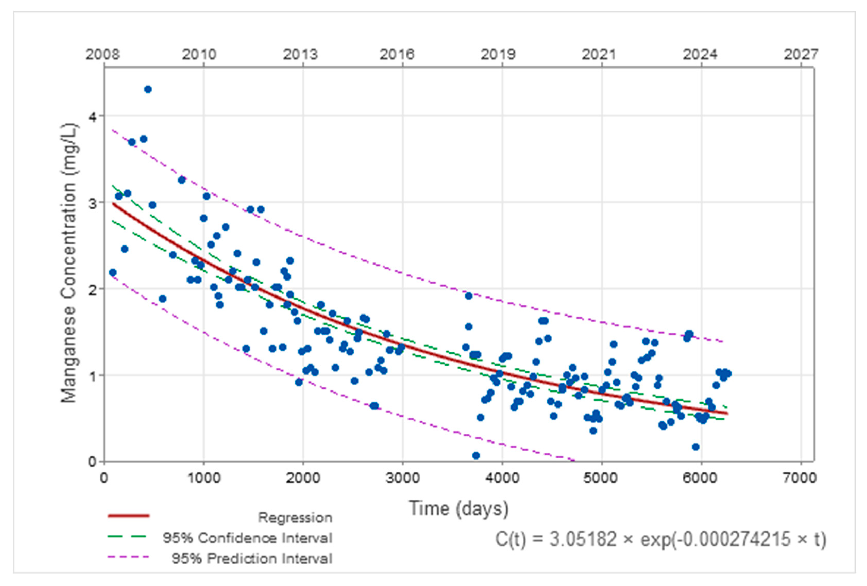 - From 2021 to 2023 (from day 4700 to day 5794): needed pH adjustment and removal of Mn (Table 5);