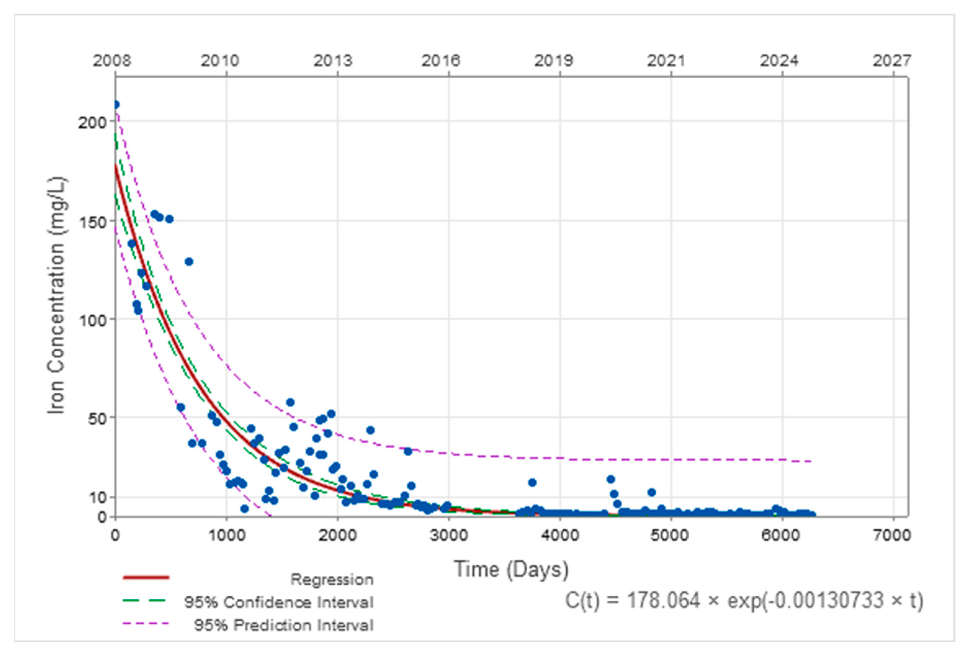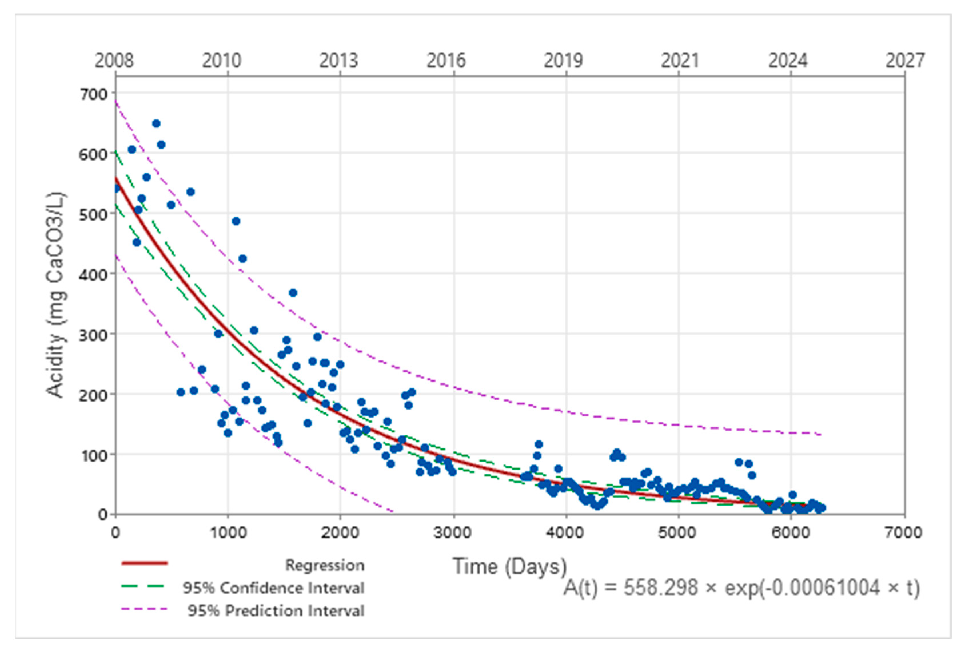 - From 2008 to 2020 (from day 1 to day 4699): needed pH adjustment and removal of metals Fe, Al, and Mn (Table 4);