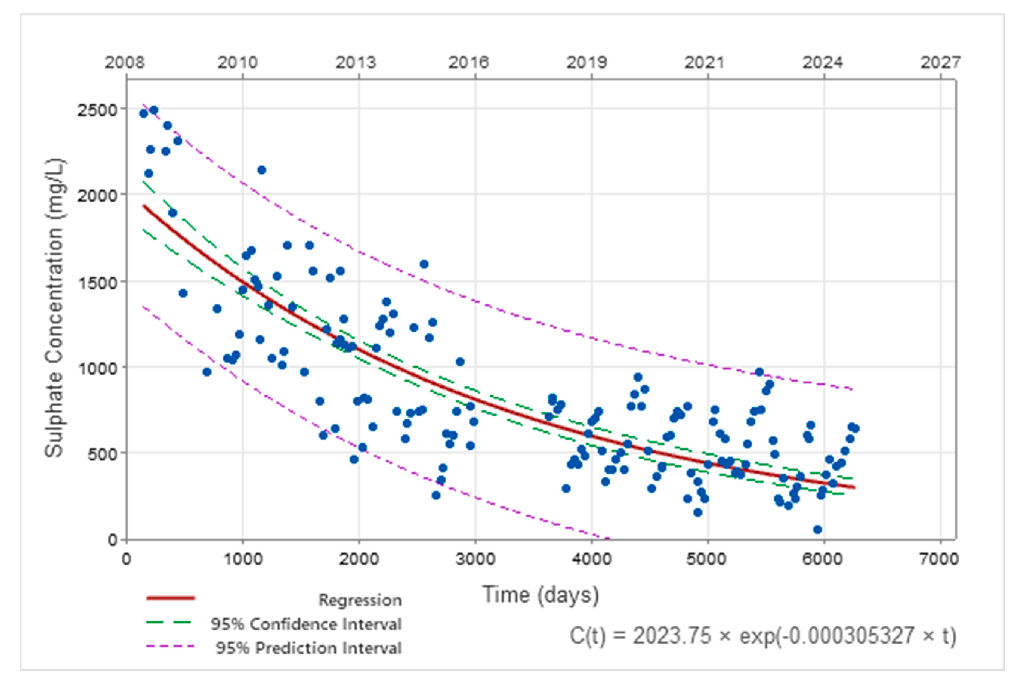Sulphates | C(t) = 2023.75.e−0.00031·t t in days C(t) = 2023.75.e−0.11·t t in years | C0 = 79.41 k = 0.000017 (t in days) k = 0.0064 (t in years) |
