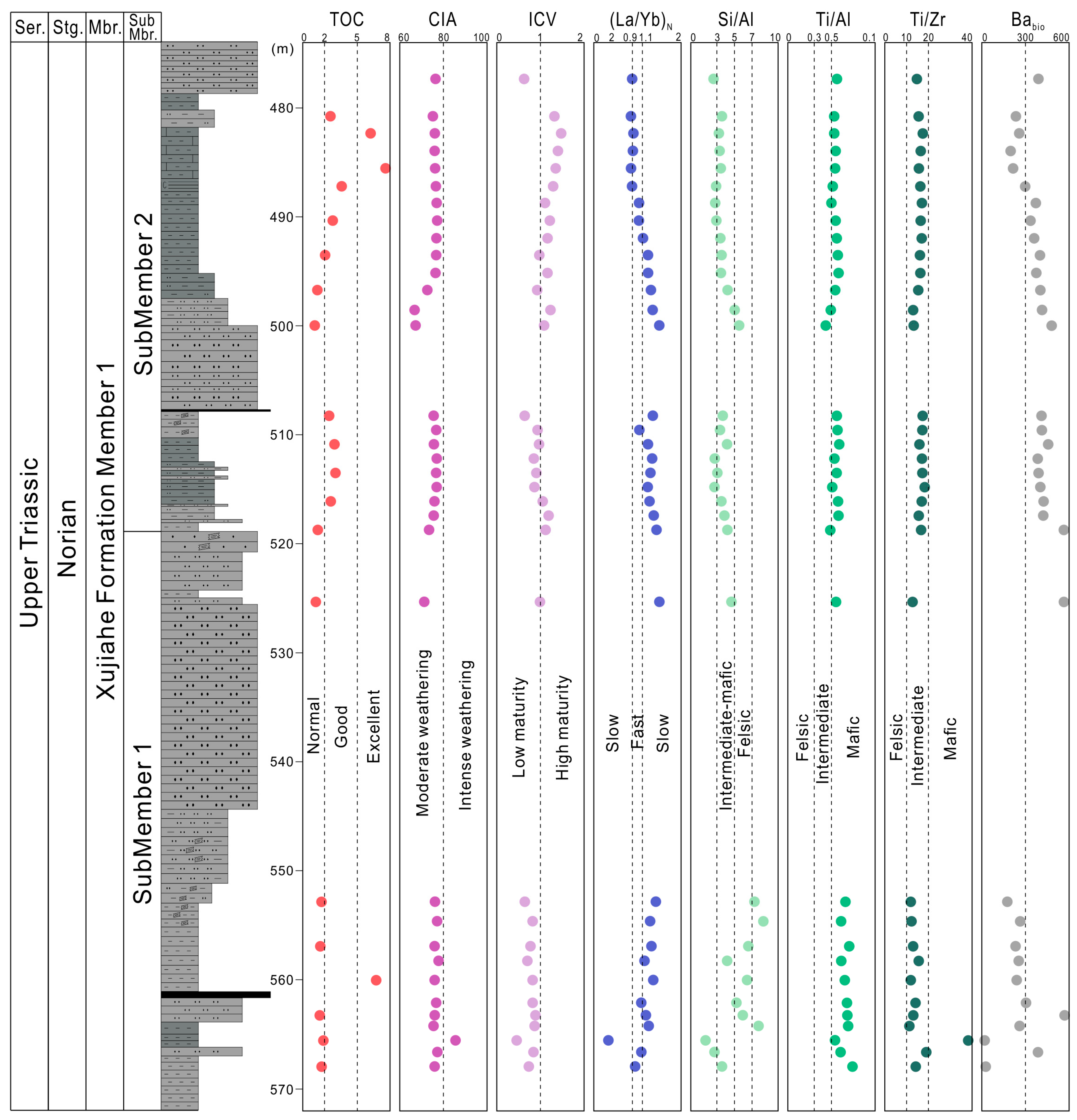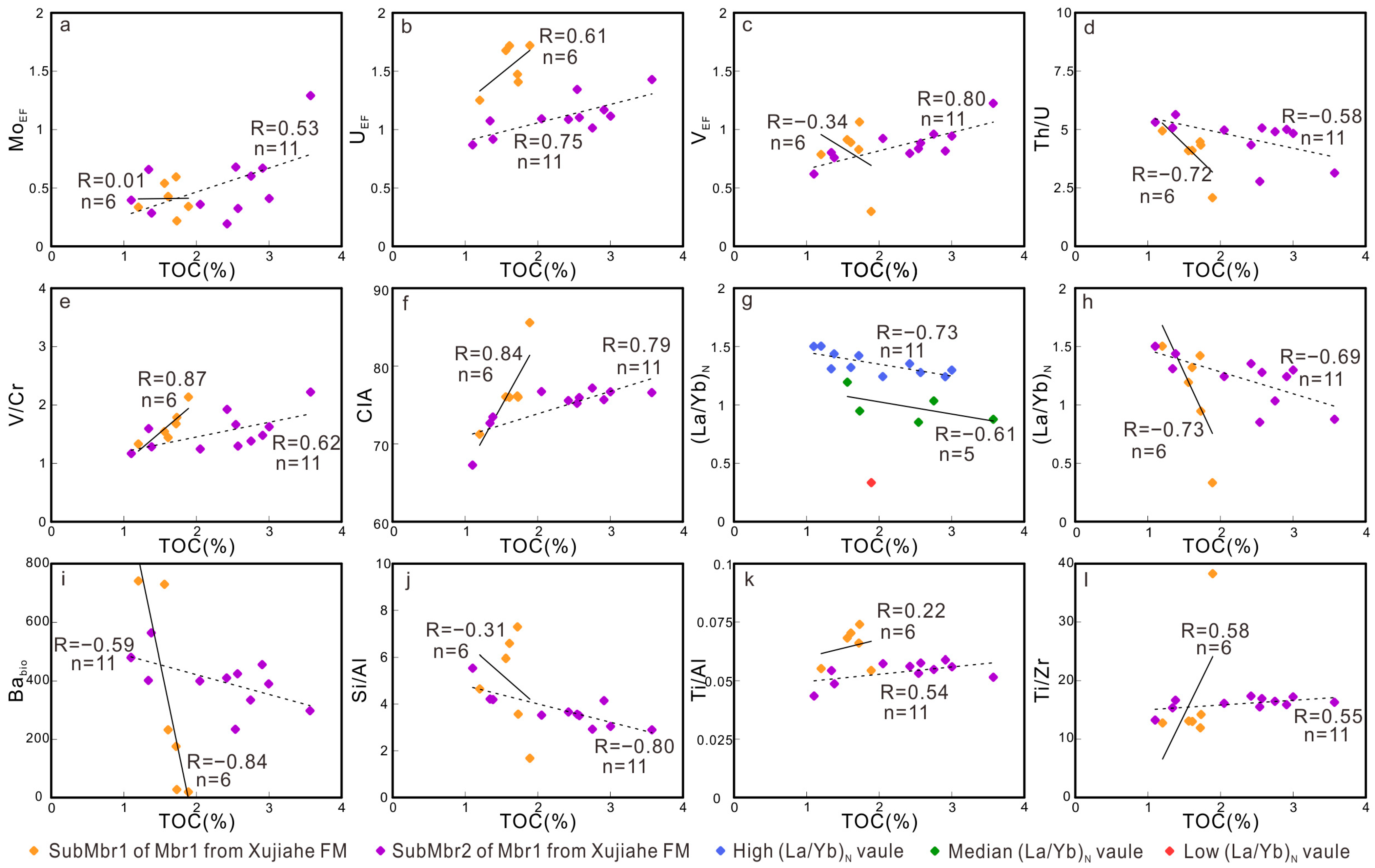 - OM enrichment resulted from the interplay and mutual influence of multiple factors, including paleoclimate, paleoproductivity, water column conditions, sedimentation rate, terrigenous input, and sea-level fluctuations. The primary controlling factors for OM enrichment in SubMbr1 of Mbr1 from Xujiahe FM were paleoclimate and sedimentation rate. In contrast, the main controlling factors for SubMbr2 were redox conditions, climate, sedimentation rate, and the adsorption by clay minerals.