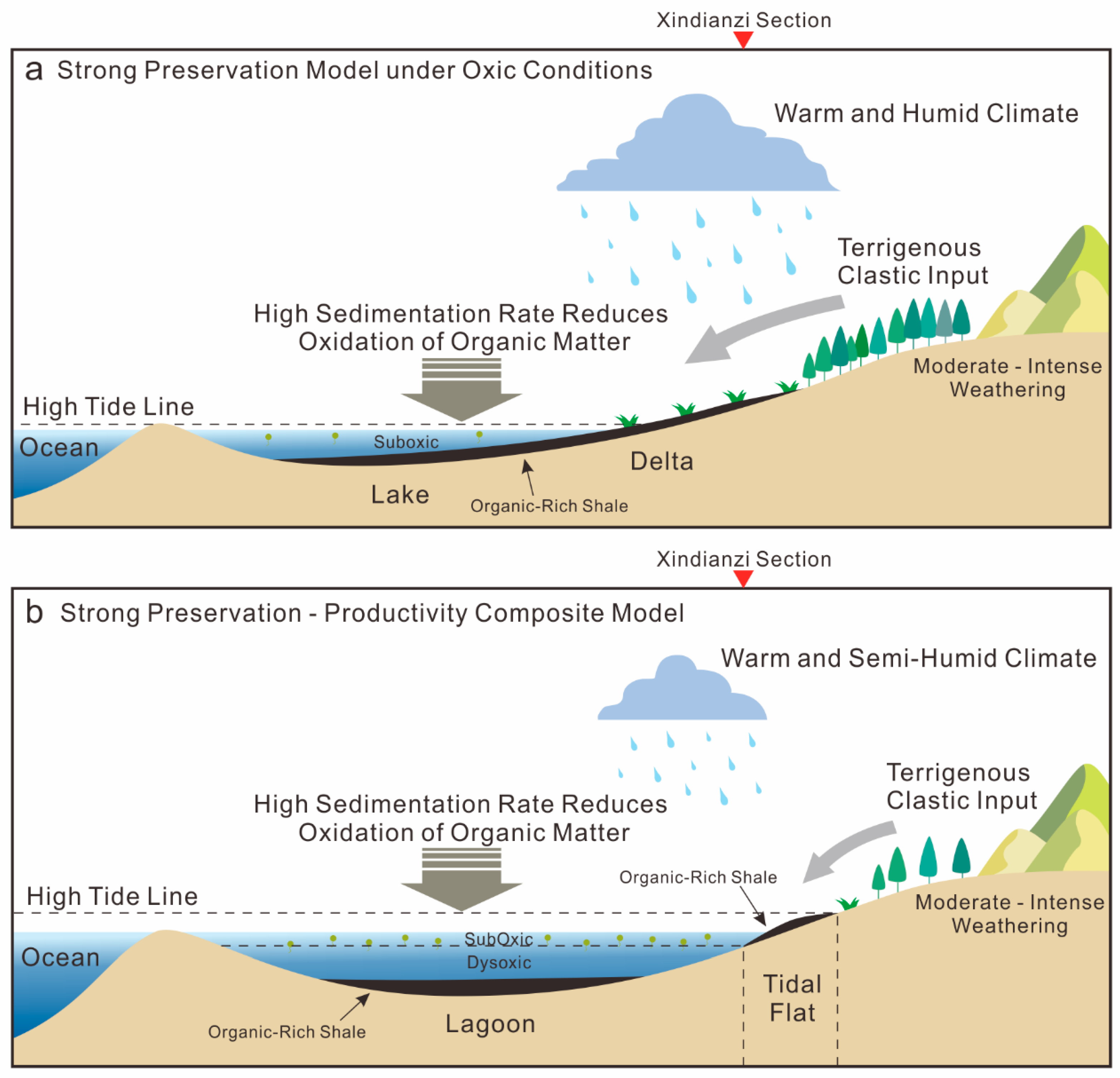 - This study reveals the OM enrichment mechanisms for different periods within the first member of Xujiahe FM, establishing two distinct models: a “strong preservation model” under relatively oxic conditions for SubMbr1 and a “strong preservation–productivity composite model” dominated by excellent preservation conditions with a secondary contribution from productivity for SubMbr2. The fundamental cause of OM enrichment is a burial rate that exceeds the decomposition rate. However, the influence of climate and water column conditions led to the formation of these two different models. The fine-grained sedimentary rocks of SubMbr1 were deposited in a weakly oxic lacustrine–deltaic environment. The warm, humid climate and ample precipitation caused intense weathering, which delivered terrigenous OM into the lake basin but also diluted it with concurrent input of felsic terrigenous clastics. Nevertheless, high sedimentation rates compensated for this dilution by rapidly burying OM before significant decomposition could occur. The fine-grained sedimentary rocks of SubMbr2 were formed in a complex marine–terrestrial transitional environment with dynamic hydrographic conditions. As the climate became relatively drier with reduced precipitation, the water body evolved into a dysoxic, weakly oxic, semi-restricted setting where aquatic organisms began to flourish, leading to a more significant increase in the influence of paleoproductivity. However, the dysoxic weakly oxic water conditions, high sedimentation rate, and adsorption of OM by clay minerals remained the dominant factors controlling the OM enrichment model.