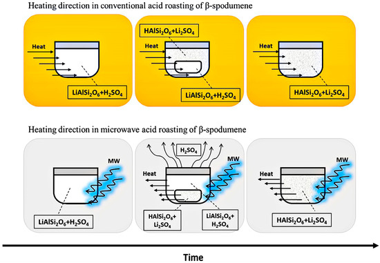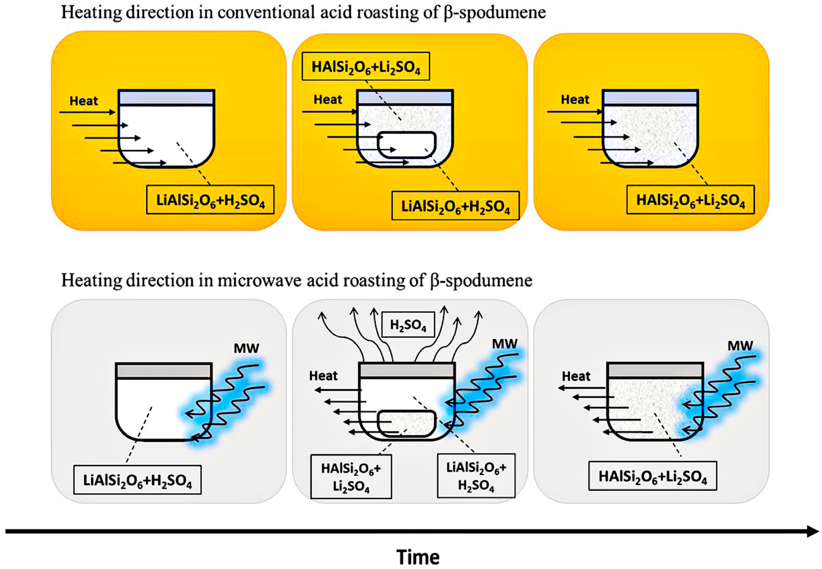 - Salakjani, N.K.; Singh, P.; Nikoloski, A.N. Acid Roasting of Spodumene: Microwave vs. Conventional Heating. Miner. Eng. 2019, 138, 161–167. [Google Scholar] [CrossRef]