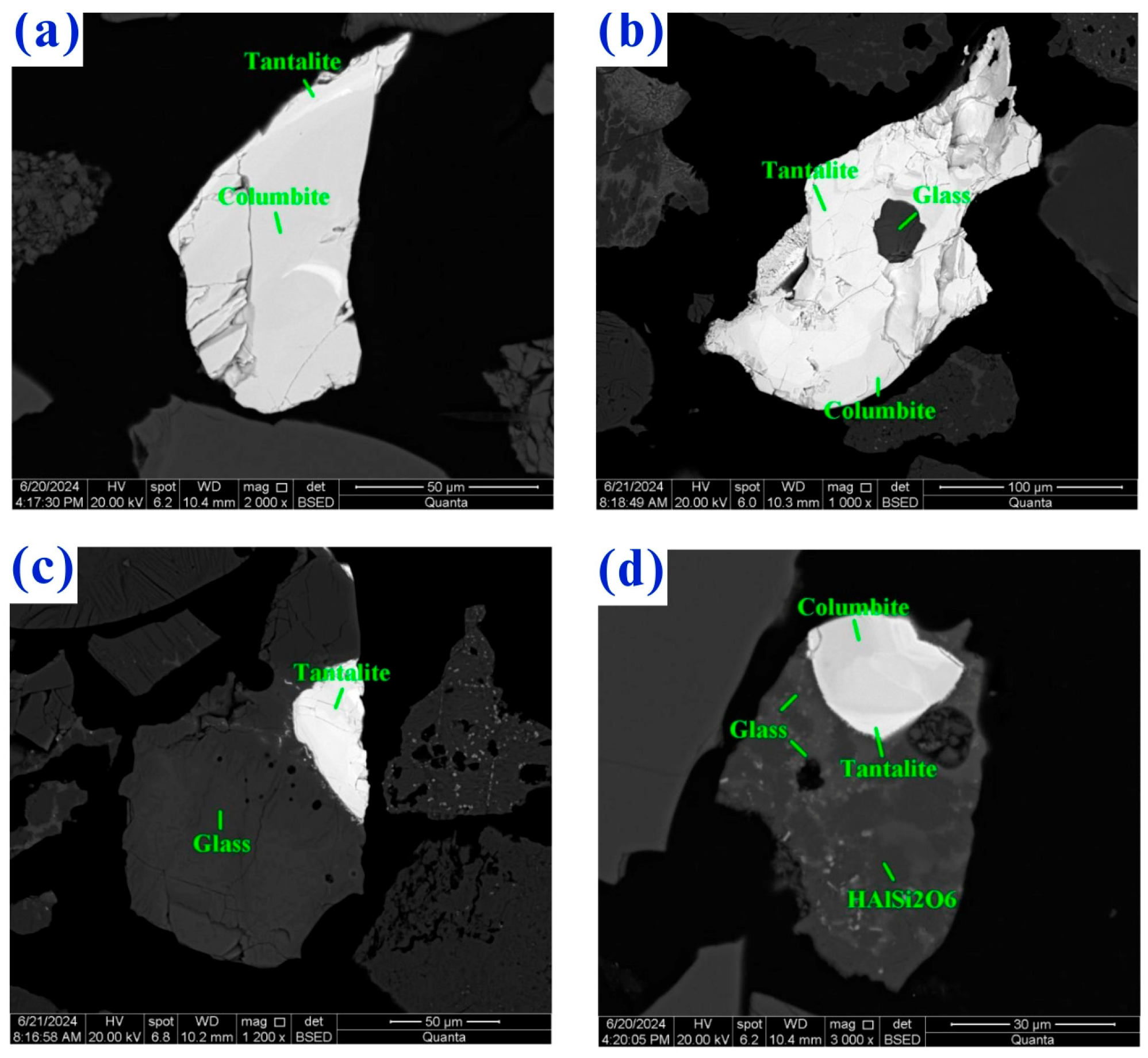 - Deng, X.X.; Zhang, J.; He, C.; He, Y.Q.; Yi, P.; Cahng, L.; Yin, Z.G. Experimental Study on Tantalum and Niobium Recovery from Lithium Slag Extracted from Sichuan Spodumene. Nonferrous Met. (Miner. Process. Sect.) 2025, 6, 83–89. [Google Scholar] [CrossRef]