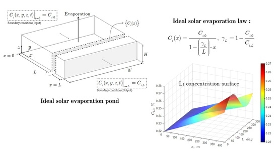 2 in the range 0.9646 to 0.9864) indicated that low values of infiltration and rainfall in the industrial ponds do not affect appreciably the lithium concentration profile. Therefore, the ideal solar evaporation law can be used to accurately predict the concentration profile of lithium in an industrial evaporation pond system, and consequently, the lithium inventory of the system.