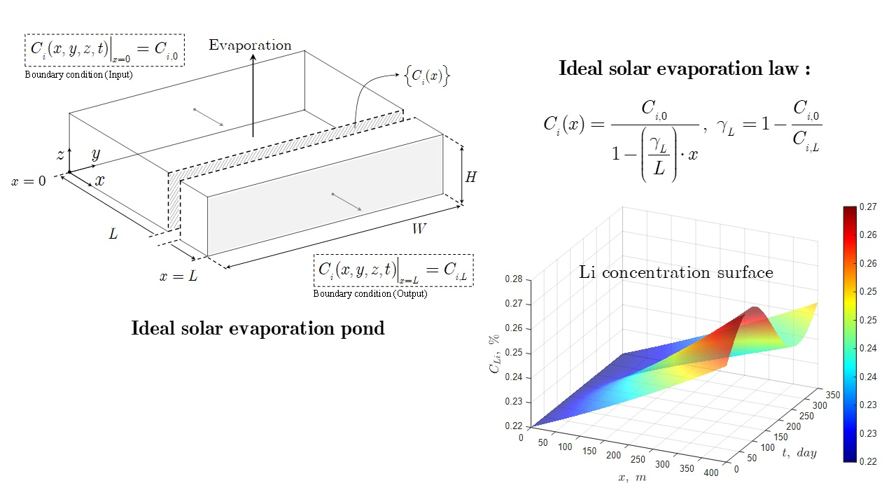 Overall, the results confirm that the ideal solar evaporation law provides a robust framework for predicting lithium concentration profiles in industrial ponds when the precipitation of lithium does not occur; and infiltration and rainfall, and the precipitation effects of other species in the brine remain low.