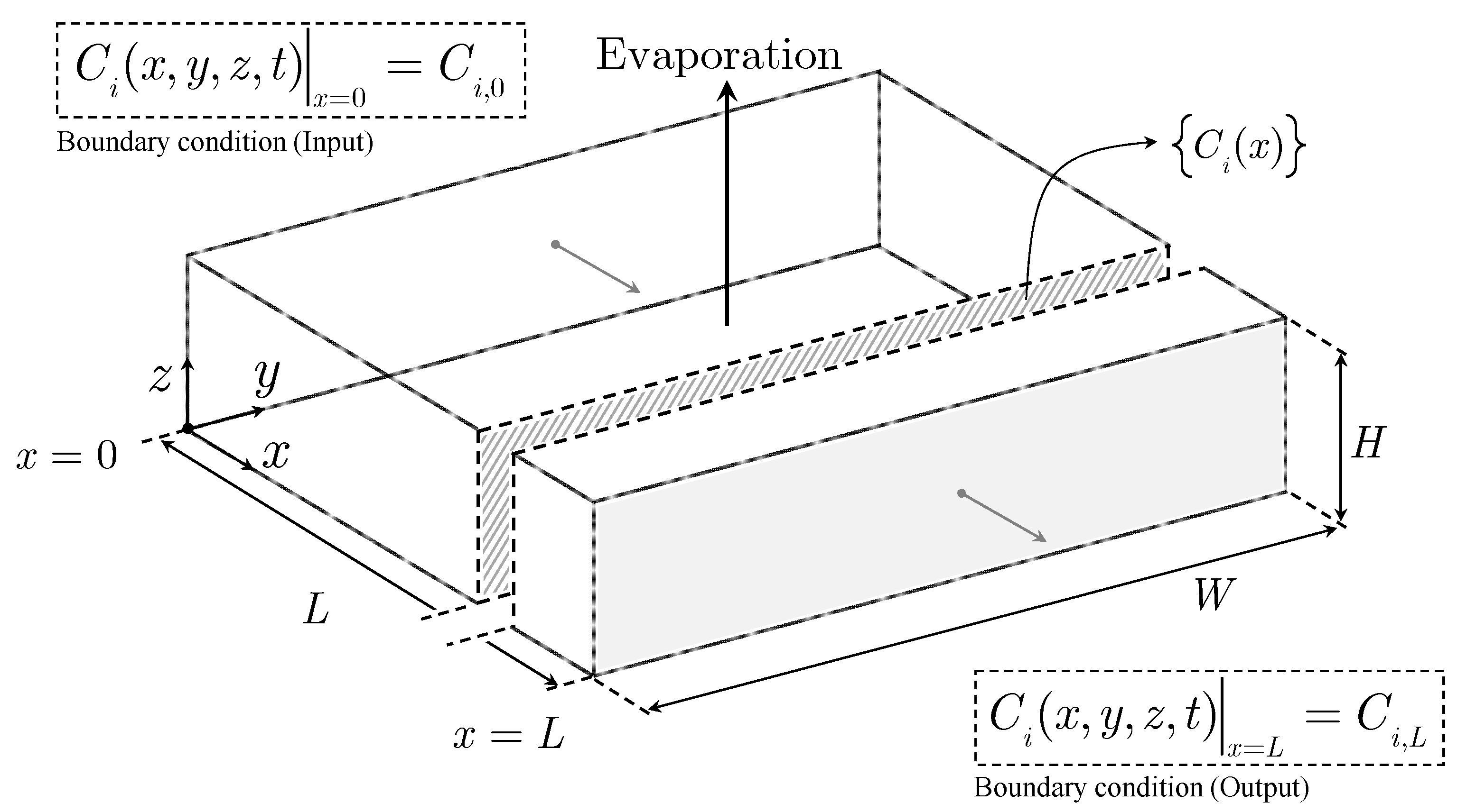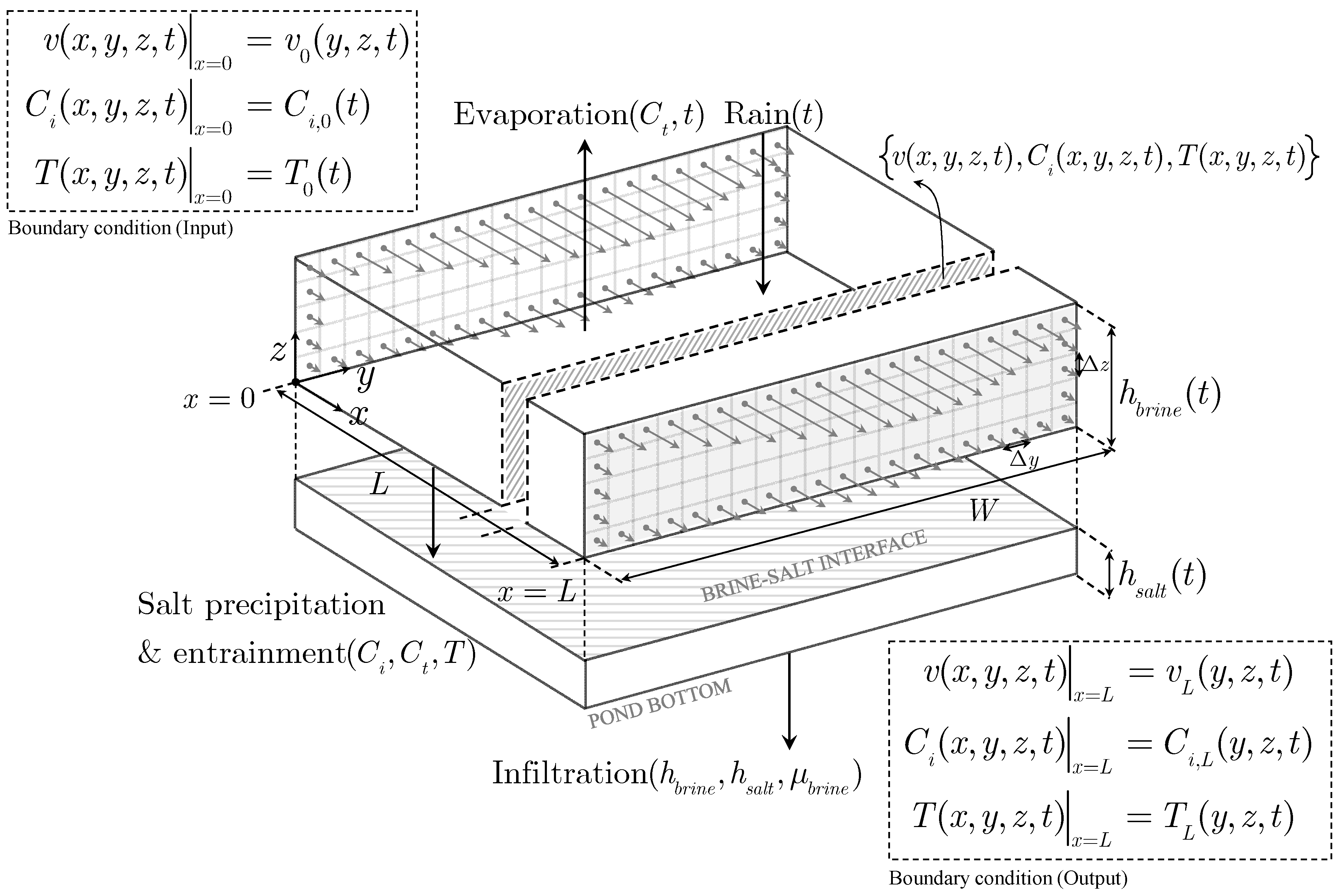 In the figure, velocity arrows indicate how the pond corners trap brine, increasing residence time, and species’ local concentrations (shades of gray). At the same time, the figure shows the length and width of the pond and how the brine is fed and discharged. The depth of the ponds is small, usually less than 1 m. Gradients in concentration also occur in the vertical direction and a layer of solid precipitates will form when the brine concentration reaches the crystallization point of some of the salts. Because the heat capacity of the brine decreases with concentration, an increase in temperature is also anticipated in the zones of higher concentrations. Thus, fields of temperature, concentration, and velocity are established, requiring the formulation and solution of the mass, energy, and momentum balances in three dimensions, together with additional equations to close the system. To illustrate this, we conceptualize a three-dimensional solar evaporation pond as shown in