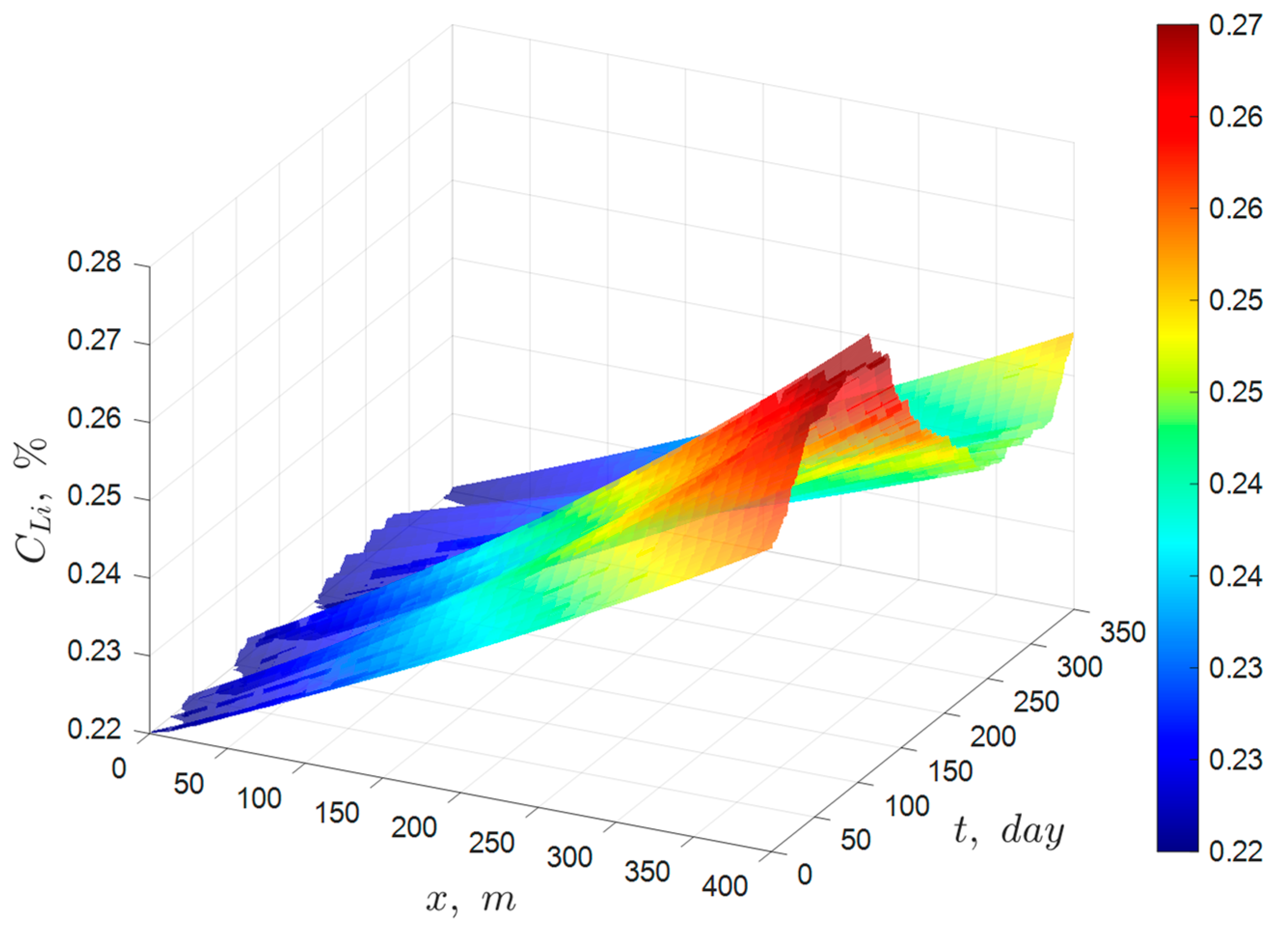 In the case of magnesium and boron in the brine, their concentrations were expected to increase proportionally with lithium according to the model assumptions. However, the experimental outlet concentrations for these species were significantly lower than predicted by the model, indicating that precipitation occurred within the pond. This is consistent with the known precipitation of magnesium primarily as potassium carnallite (KMgCl3·6H2O) and bischofite (MgCl2·6H2O), and boron precipitation mainly as calcium borate (Ca3(BO3)2). As a result, the ideal solar evaporation model cannot be used to determine the magnesium and boron concentration profiles under these conditions. However, it allows predicting the amounts of B and Mg that precipitate in the pond. The concentration behavior of B and Mg will be addressed further in subsequent articles, using more advanced models developed by the authors. Nevertheless, despite the precipitation of B and Mg in the pond system, the possible entrainment of lithium within the solid phases does not notably affect its concentration profile, thereby preserving the validity of the ideal solar evaporation model for lithium.