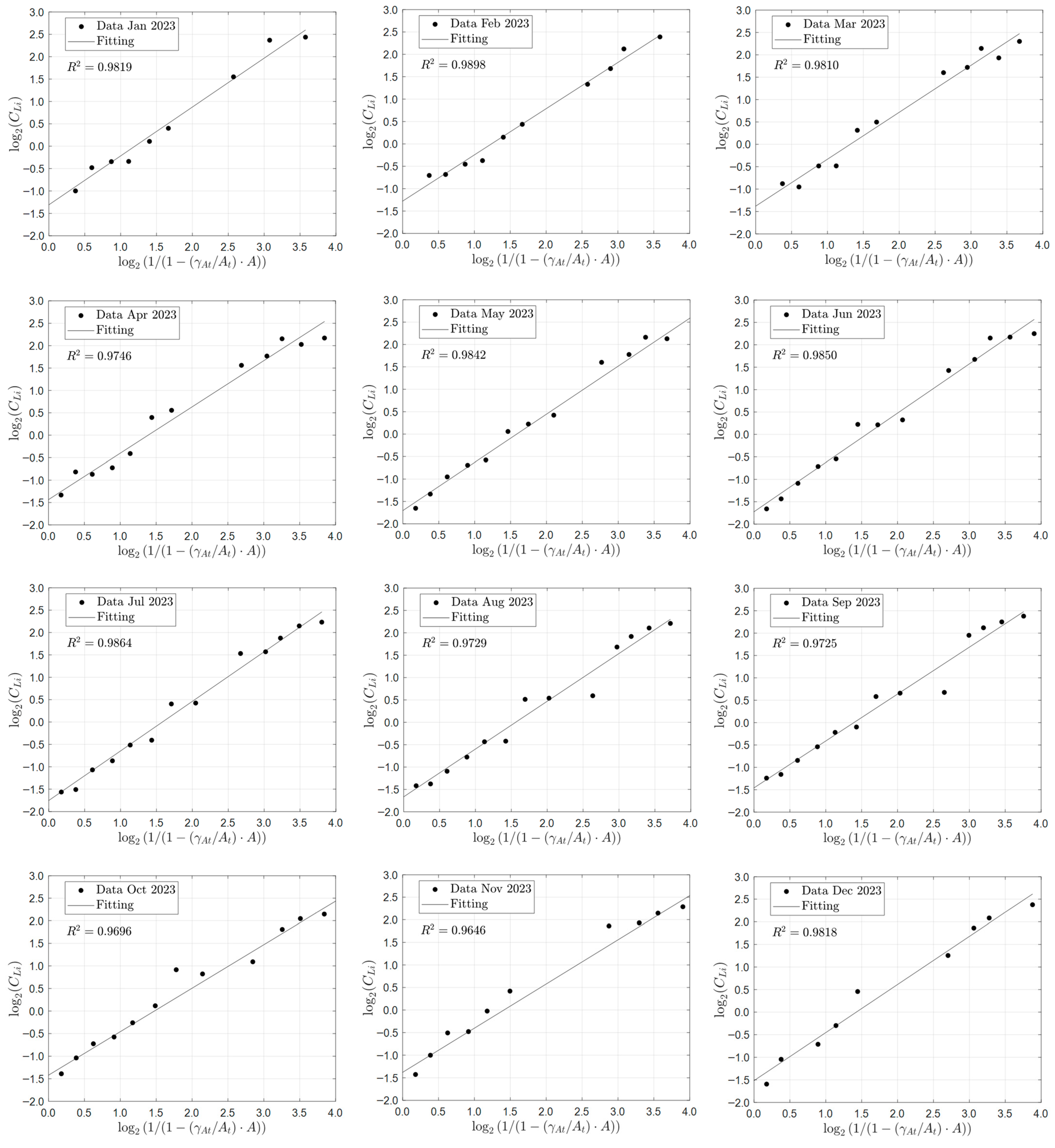 Figure 13, which shows the comparison between the predictions of the ideal solar evaporation law and the experimental data for lithium from January to December 2023. The linear Equation (11) was used for the validation to better visualize deviations from a straight-line behavior and to protect Albemarle’s proprietary data. The good agreement observed (R