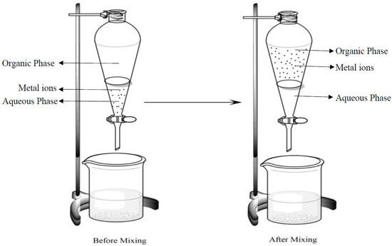 In the solvent extraction process, the organic and the aqueous phases were mixed vigorously inside a beaker that was at room temperature for 15 min. After that, the mixture was poured into the separating funnel. After waiting for some minutes, two layers were formed. The density of the organic phase is lower than that of the aqueous phase, due to which the aqueous phase settles below the organic phase. After that, both layers were separated out. Figure 2 represents the schematic diagram for the solvent extraction process. The organic phase was then scrubbed with warm distilled water to remove impurities. The metal ions were then stripped out from the organic phase by using 10% H2SO4.