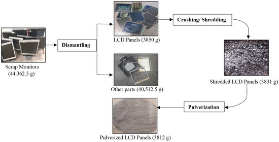 Scrap monitors (HCM 700PA (Dell Inc., Round Rock, USA), Samsung MJ19ASSS/XTP (Samsung Electronics Co. Ltd., Suwon, Republic of Korea), and Belinea 10 17 10 (MAXDATA Computer GmbH, Marl, Germany)) were used as the primary source materials in this study. Sulfuric acid (H2SO4, 98 wt.%), hydrochloric acid (HCl, 37 wt.%), and nitric acid (HNO3, 70 wt.%) were obtained from E. Merck, Mumbai, India. Filtration was carried out using Whatman filter papers (Cytiva, Marlborough, MA, USA) (No. 42). All chemicals employed were of analytical grade.