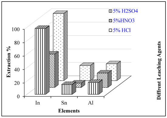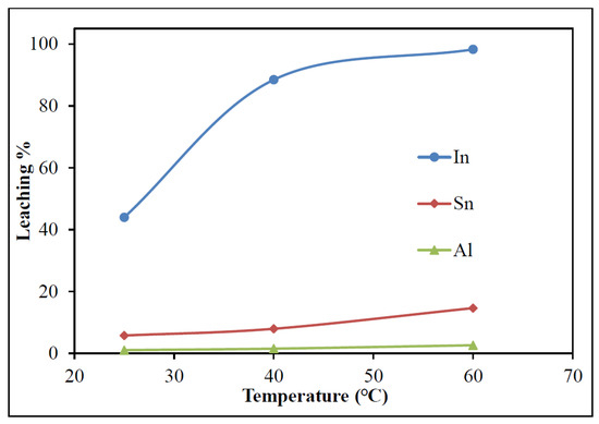 Based on this trend, 5% H2SO4 was identified as the optimum concentration in this study, as it ensured 98.1% recovery of In while limiting the dissolution of impurities. Operating beyond this point would increase Al and Sn contamination in the leach liquor and escalate acid consumption.