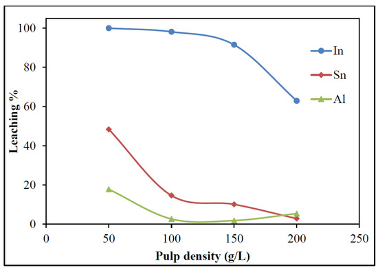 Pulp densities ranging from 50–200 g/L were tested at 5% H2SO4, 60 °C, and 30 min (Figure 6). Between 50 and 100 g/L, In leaching remained almost unchanged at near-complete levels, while the dissolution of Sn and Al decreased, keeping impurity levels low.